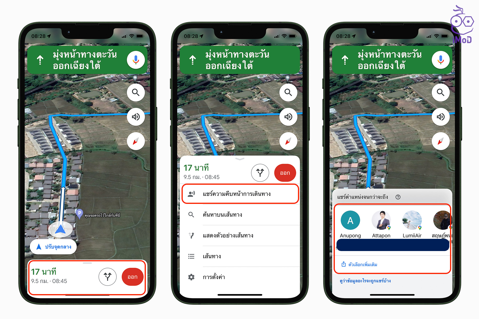 หากเรามีนัดสำคัญหรือต้องการให้ผู้ที่รออยู่ปลายทางทราบว่าเรากำลังเดินทางถึงที่ไหนแล้ว ก็สามารถใช้วิธีการแชร์ความคืบหน้าการเดินทางได้ ผู้ที่รับแชร์ก็จะเห็นการเดินทางของเราบนแผนที่ Google Maps แบบเรียลไทม์