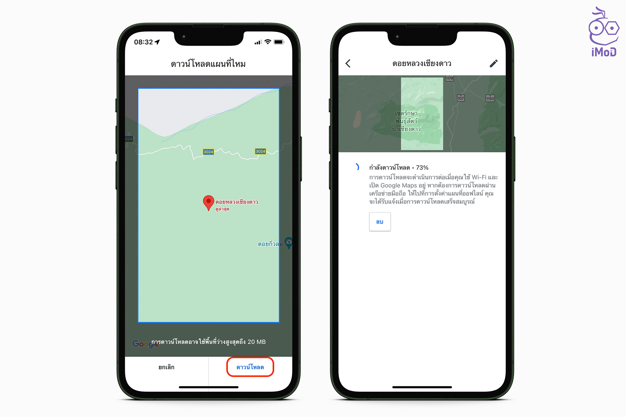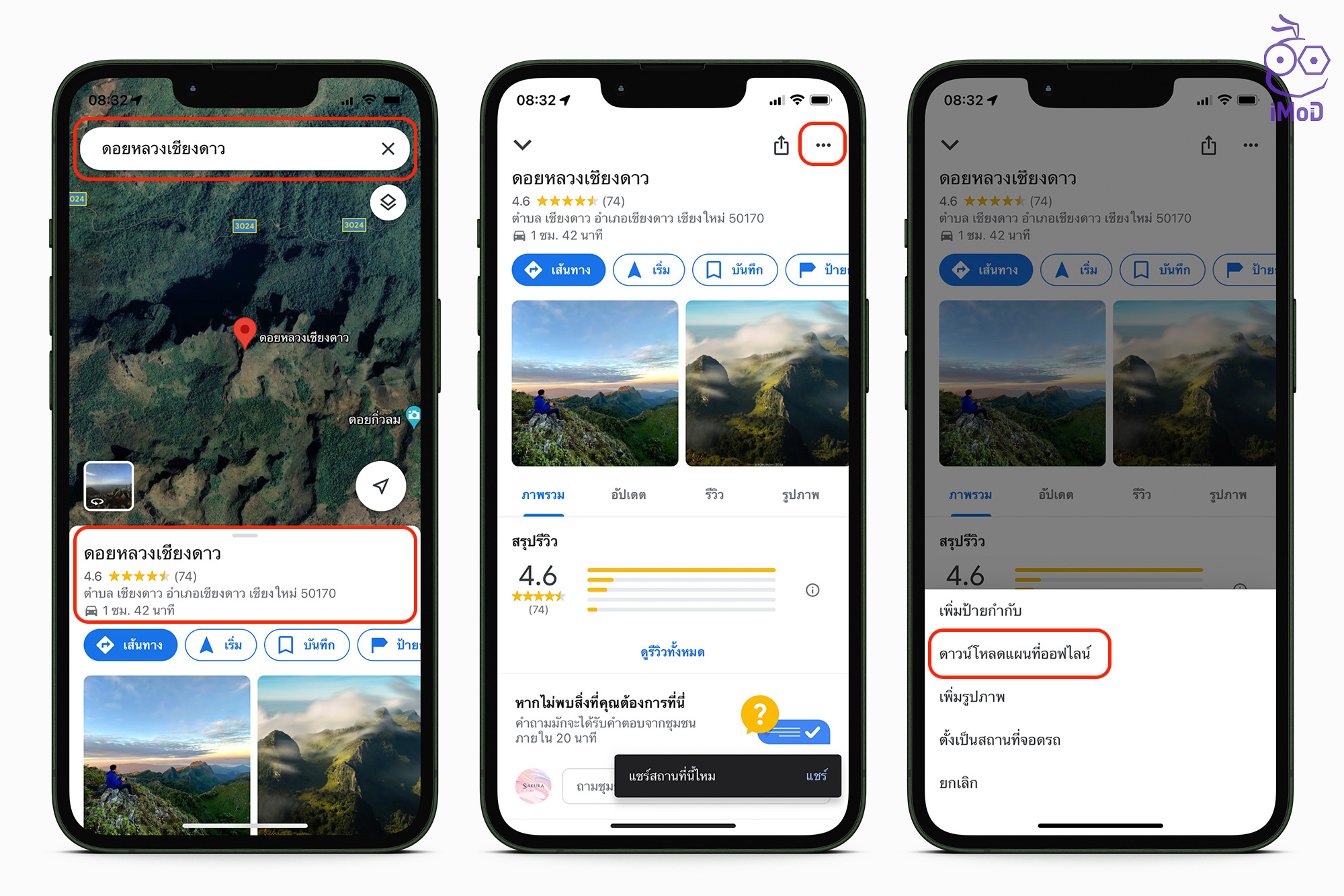 ให้เริ่มด้วยค้นหาสถานที่ที่เราวางแผนจะเดินทาง เมื่อได้แล้วให้แตะข้อมูลด้านล่าง > แตะไอคอน 3 จุด มุมบนขวา > แตะ ดาวน์โหลดแผนที่ออฟไลน์