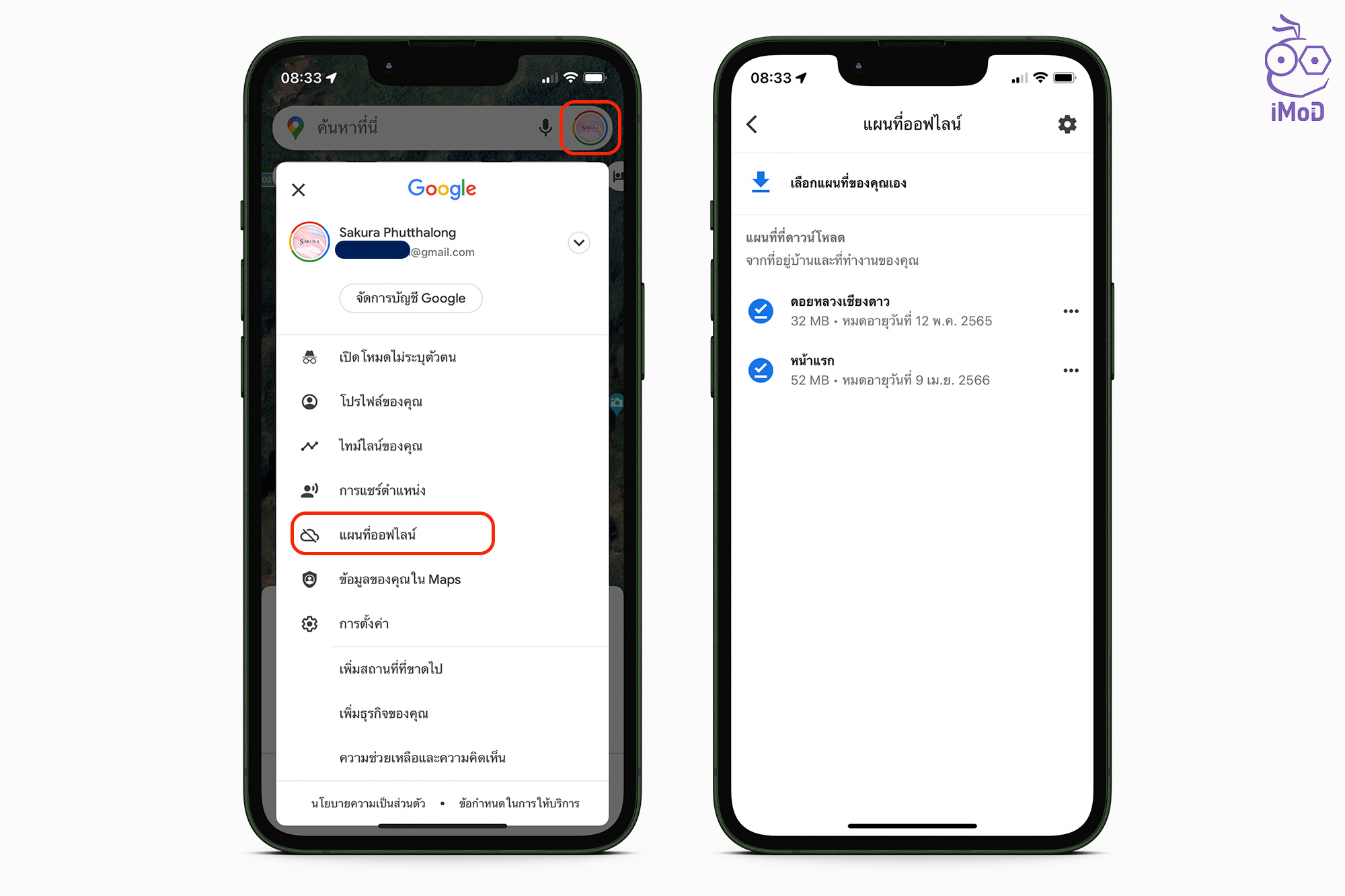 เมื่อถึงเวลาที่เราเดินทางและต้องเปิดการนำทางแบบออฟไลน์ ให้แตะที่โปรไฟล์ > แผนที่ออฟไลน์ > เลือกสถานที่ที่ดาวน์โหลดไว้ แล้วเริ่มนำทางได้เลย
