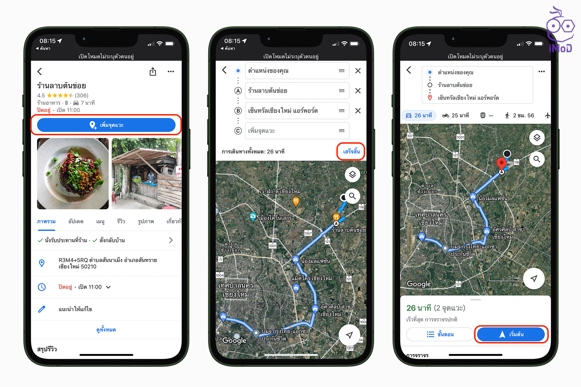 เมื่อเลือกสถานที่แวะพักได้แล้ว ให้แตะ เพิ่มจุดแวะ > แตะ เสร็จสิ้น > เมื่อเพิ่มจุดแวะเรียบร้อยแล้ว เส้นทางก็จะแสดงการนำทางไปยังจุดแวะตามลำดับที่เราตั้งค่าไว้ แตะเริ่มต้นเพื่อเริ่มนำทางได้เลย