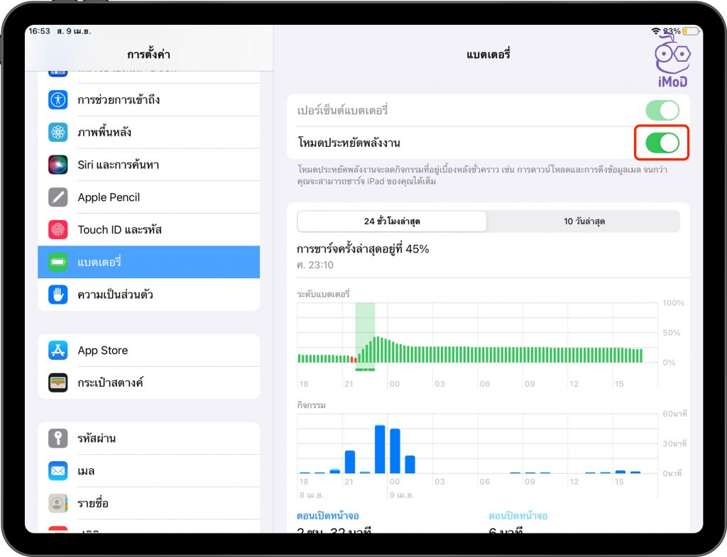 เมื่อเราเปิดโหมดประหยัดพลังงานแล้ว เราก็จะสามารถทำงานต่าง ๆ บน iPad ได้ยาวนานขึ้น หากนำเครื่องไปชาร์จจนแบตเตอรี่เต็มแล้ว โหมดนี้ก็จะปิดเองอัตโนมัติ