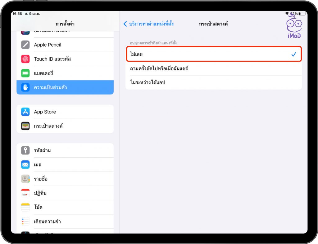 การใช้งานแอปบน iPad อาจมีบางแอปที่ใช้บริการตำแหน่งที่ตั้งเพื่อเรียนรู้วตำแหน่งที่ตั้งของเรา อาจจะมีประโยชน์สำหรับแอปที่ใช้นำทาง แอปสั่งอาหาร แอปแจ้งเตือนกล้องจับความเร็ว เป็นต้น แต่สำหรับบางแอปนั้นอาจจะไม่จำเป็นต้องใช้ตำแหน่งที่ตั้งตลอดเวลา เราก็สามารถตั้งค่าปิดได้ ก็จะช่วยลดการใช้พลังงานในเครื่องได้