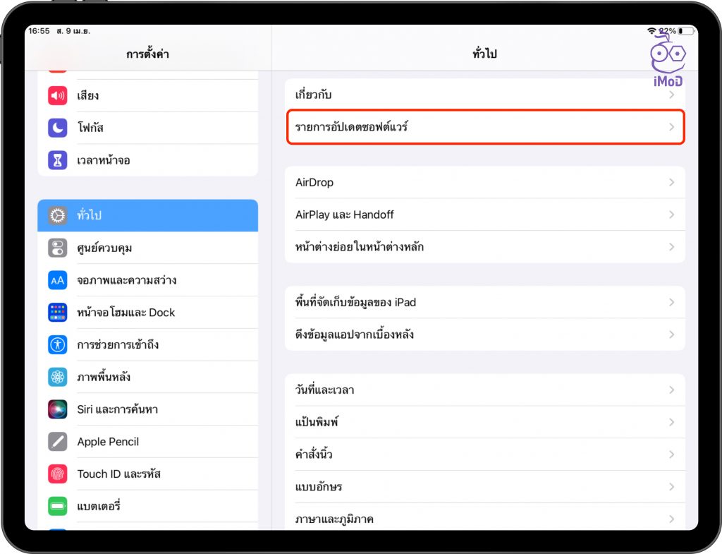 เช็ครายการอัปเดตซอฟต์แวร์ได้ที่ การตั้งค่า (Settings) > ทั่วไป (General) > รายการอัปเดตซอฟต์แวร์ (Software Update)