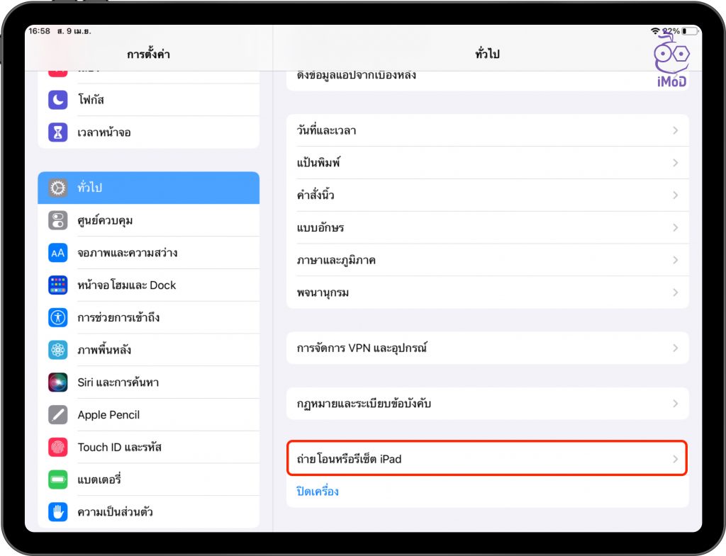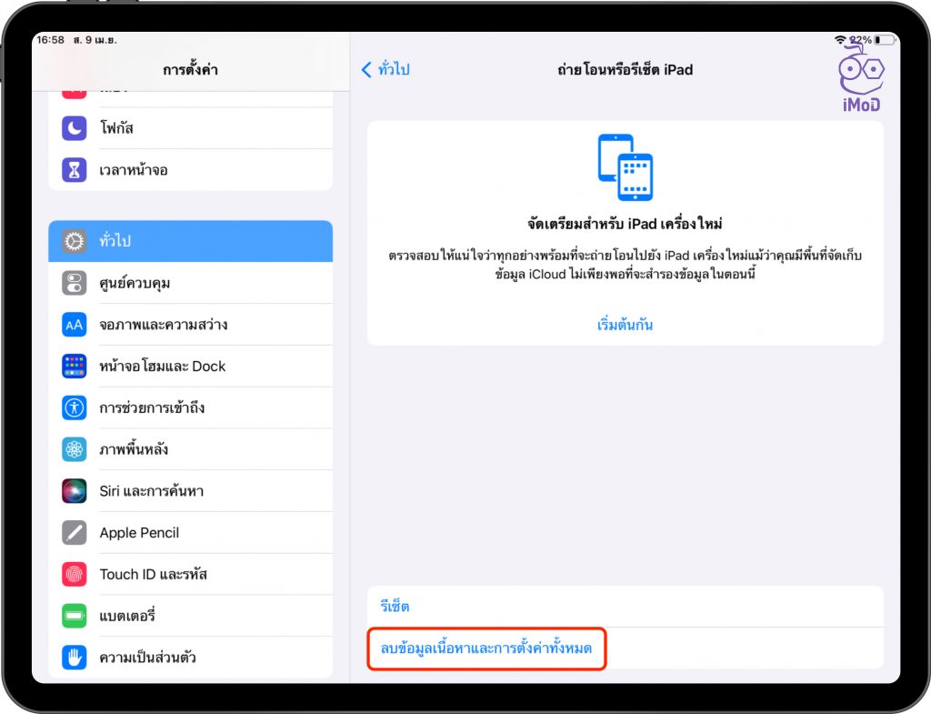 การตั้งค่า (Settings) > ทั่วไป (General) > ถ่ายโอนหรือรีเซ็ต iPad (Transfer or Reset iPad)