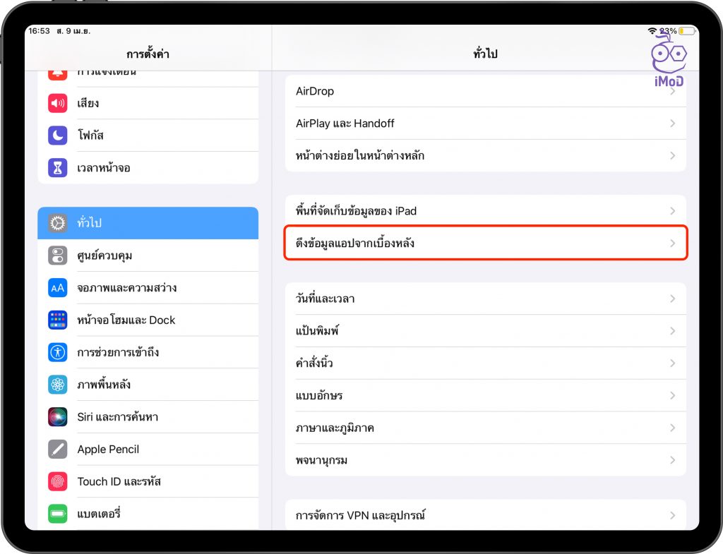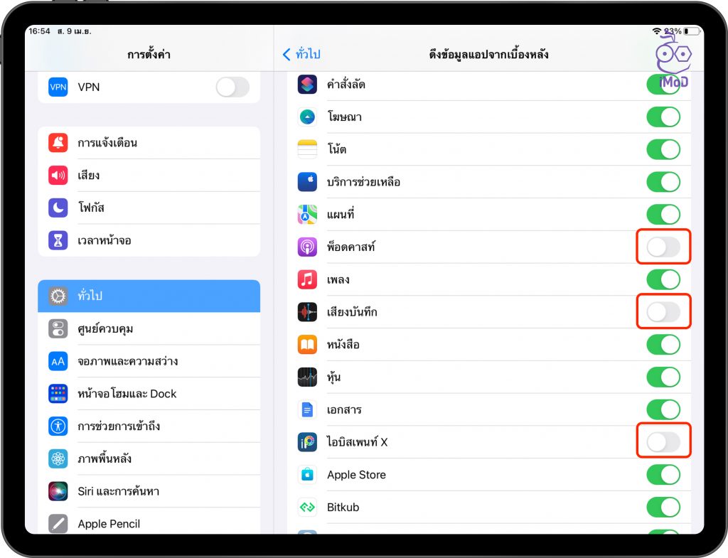 ไปที่ การตั้งค่า (Settings) > ทั่วไป (General) > ดึงข้อมูลแอปจากเบื้องหลัง (Background App Refresh)