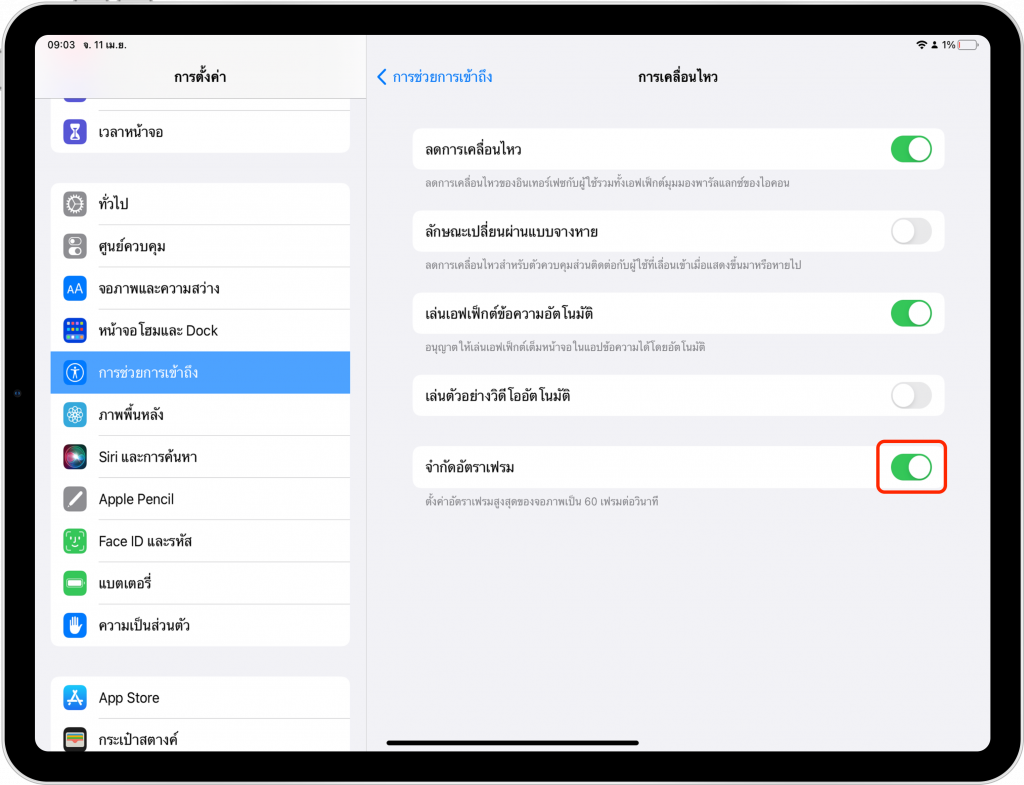 ไปที่ การตั้งค่า (Settings) > การช่วยการเข้าถึง (Accessibility) > การเคลื่อนไหว (Motion) > เปิด จำกัดอัตราเฟรม (Limit Frame Rate)