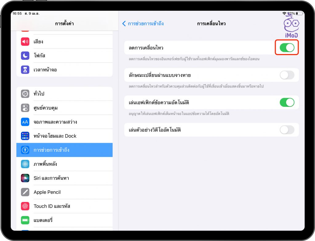 ส่วน iPad ที่ไม่มีคุณสมบัติ ProMotion ก็สามารถตั้งค่าลดการเคลื่อนไหว เพื่อช่วยให้ประหยัดพลังงานได้เช่นกัน แต่ภาพการเคลื่อนไหวก็จะไม่สมูทเหมือนเดิมแล้วนะ