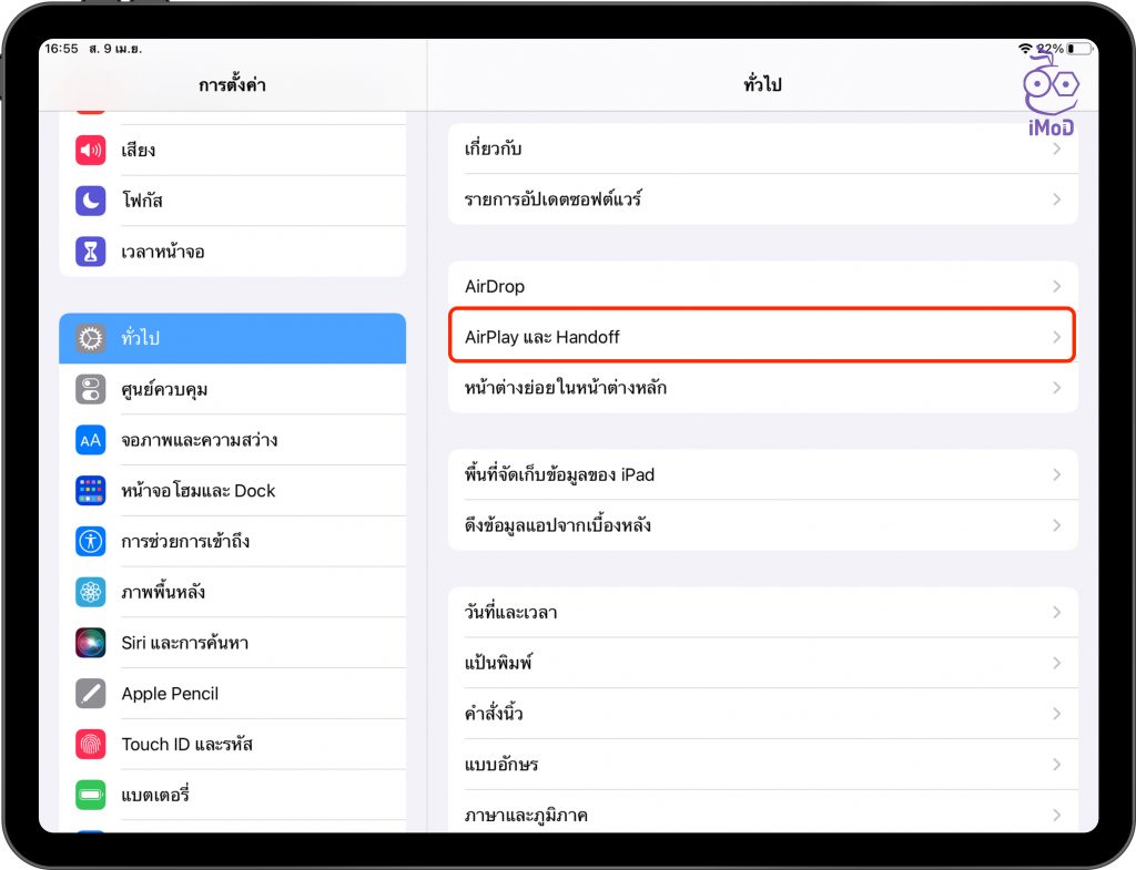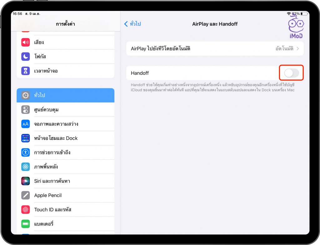 ไปที่ การตั้งค่า (Settings) > ทั่วไป (General) > AirPlay และ Handoff (AirPlay & Handoff)