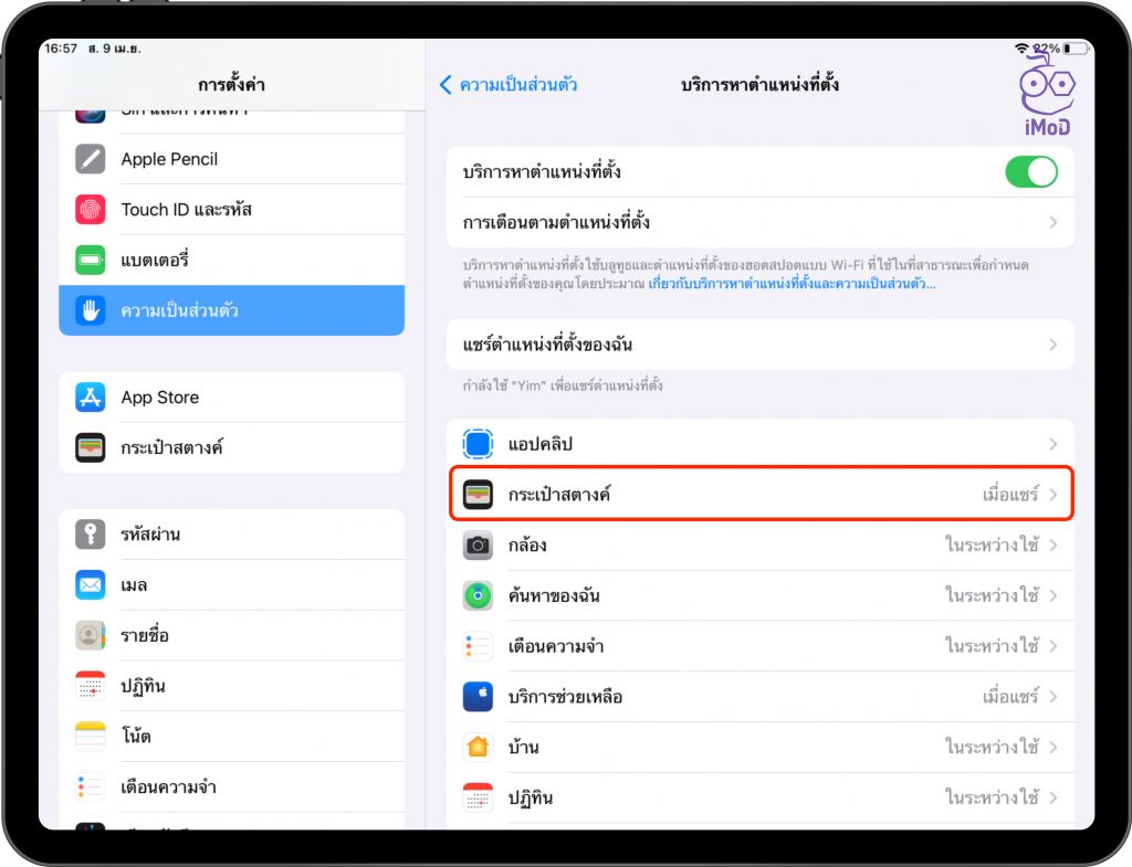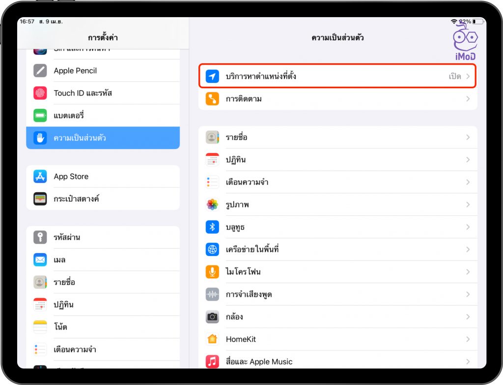 ไปที่ การตั้งค่า (Settings) > ความเป็นส่วนตัว (Privacy) > บริการตำแหน่งที่ตั้ง (Location Service)