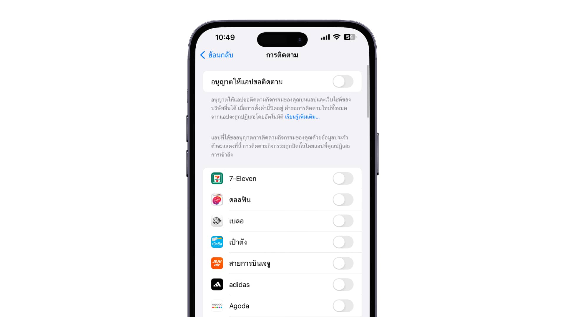 เข้าไปทบทบทวนและจัดการการติดตามจากแอปต่าง ๆ เพราะฟีเจอร์ App Tracking Transparency จะให้เราเลือกได้ว่าเราจะอนุญาตให้แอปไหนติดตามเราได้บ้าง แนะนำให้ “ไม่อนุญาต” เพราะแอปส่วนใหญ่มักจะนำข้อมูลส่วนตัวรวมถึงพฤติกรรมการใช้งานของเราไปใชในเชิงพาณิชย์