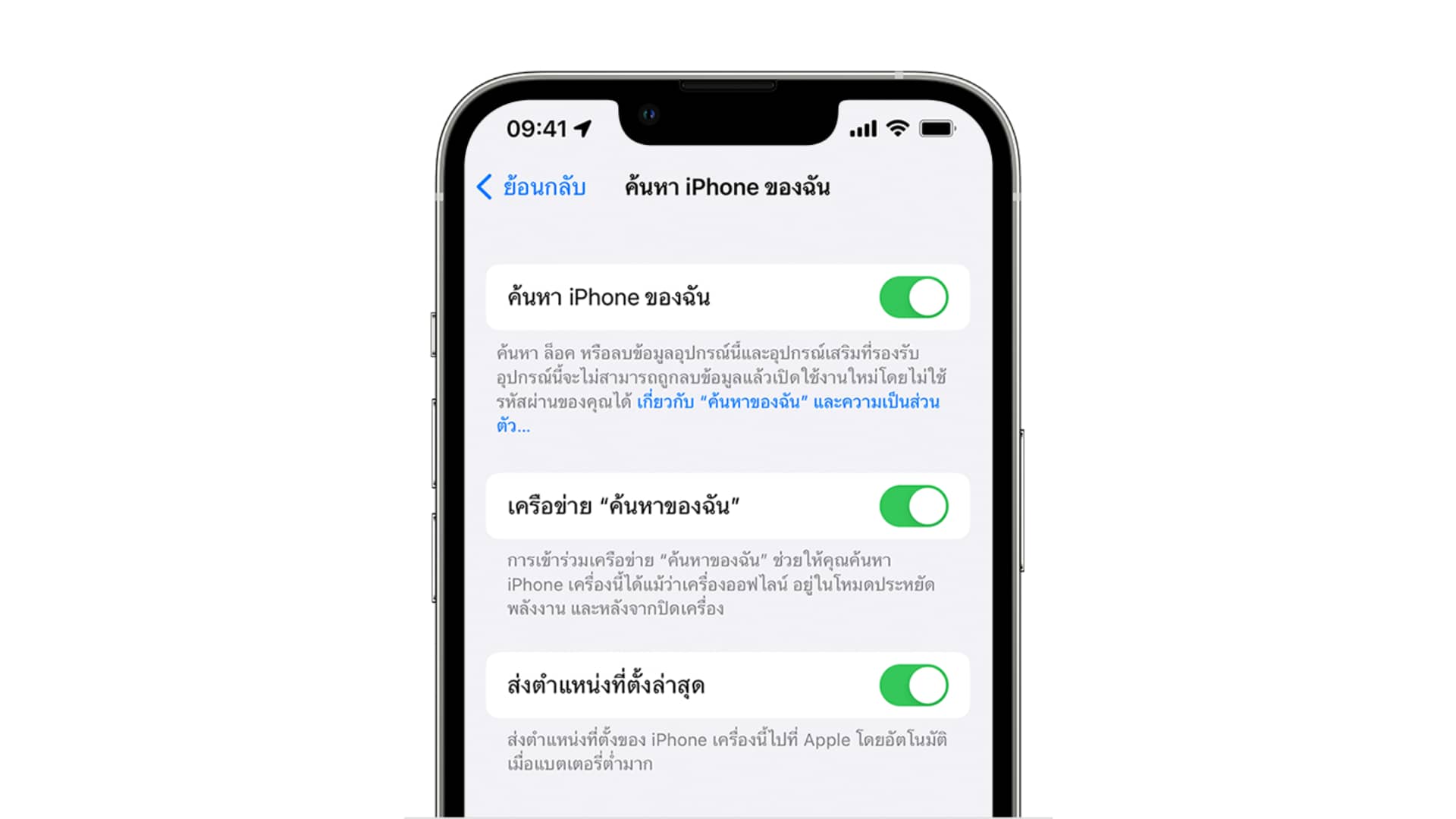 เข้าไปตั้งค่าได้ที่ การตั้งค่า > แตะที่ชื่อ Apple ID > ค้นหาของฉัน > เปิด ค้นหา iPhone ของฉัน