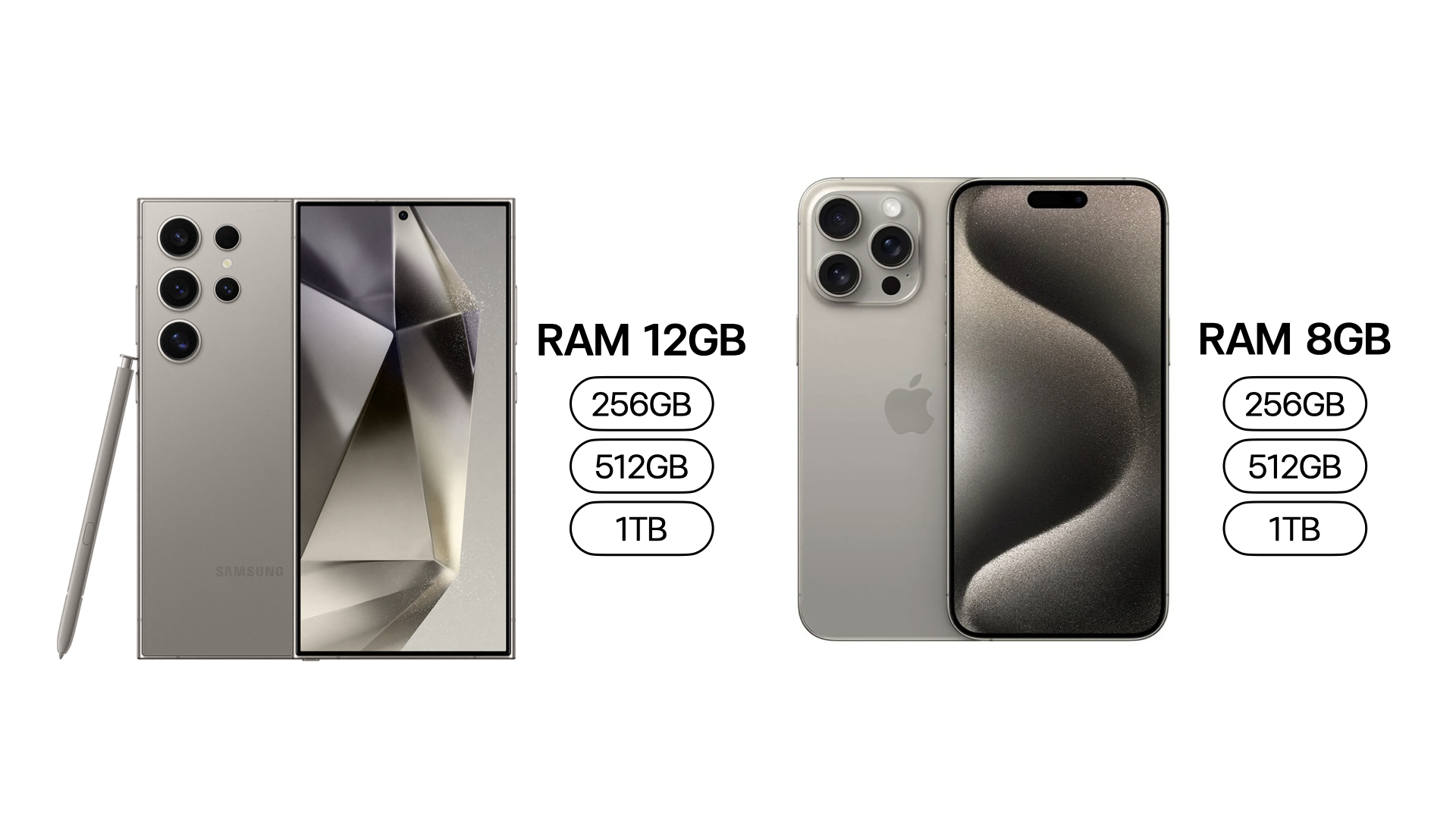 ซึ่งในตอนนี้ Galaxy S24 Ultra มาพร้อม RAM 12GB ทุกรุ่นความจุ ในขณะที่ iPhone 15 Pro Max มาพร้อม RAM 8GB ถึงแม้จะดูมีความจุที่มากพอสำหรับการทำงาน แต่การที่ยิ่งมี RAM มากเท่าไหร่ การใช้งานหลายแอปพร้อมกัน หรือการทำงานแบบ Multi Tasking ก็จะทำได้ลื่นไหล รวดเร็ว และมีประสิทธิภาพมากยิ่งขึ้น