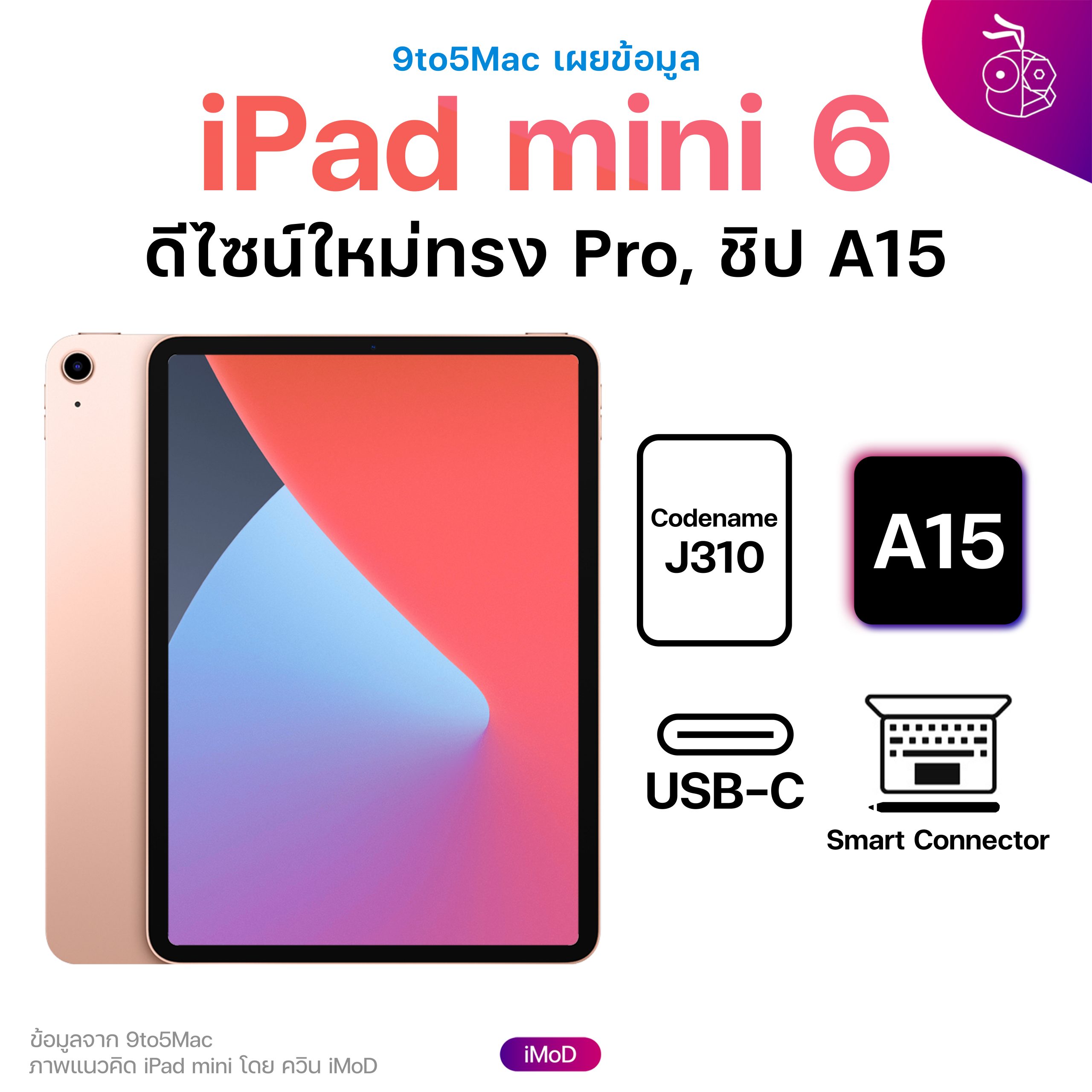9to5Mac เผยว่า iPad mini ตัวใหม่จะใช้ codename ว่า J310 ใช้ดีไซน์เหมือน iPad Air 4 คือ จอเต็มขอบไร้ปุ่มโฮม มาพร้อมพอร์ต USB-C, Smart Connector แถบแม่เหล็ก และอาจใช้ชิป A15 ด้วย