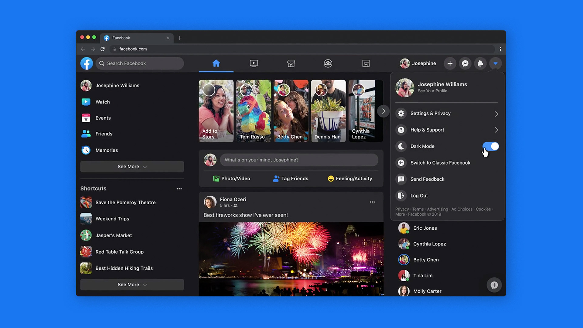 สำหรับหน้าตาใหม่มาพร้อมกับ Drak Mode ที่สามารถเปิดปิดได้ตามสมัยนิยม ตามที่เคยได้ประกาศในงาน F8 เมื่อปีที่แล้ว และผ่านการทดสอบไปร่วมหนึ่งปี โดยสำหรับแอปพลิเคชัน iOS ได้รับการอัปเดตไปตั้งแต่เดือนพฤษภาคม 2562 และการปรับหน้าตาเว็บไซต์อันนี้ค่อนข้างล่าช้าจากเดือนมกราคม
