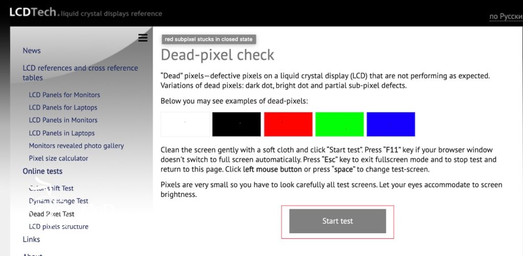 ตรวจเช็ค Dead Pixel & Bright Pixel เพื่อดูว่าหน้าจอแสดงสีผิดปกติหรือไม่ โดยเช็คได้ที่เว็บไซต์ lcdtech.info [แตะเข้าเว็บไซต์เพื่อเช็คที่นี่] จากนั้นให้คลิก Start Test หน้าจอ