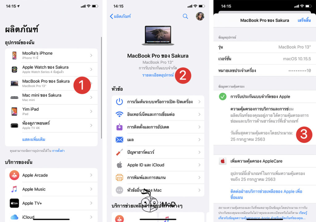 ถ้าหากมี iPhone หรือ iPad แนะนำให้ดาวน์โหลดแอป Apple Support มาใช้งาน จากนั้นให้ล็อกอินด้วย Apple ID โดยบน MacBook ก็ต้องล็อคอิน Apple ID เดียวกันด้วย เราก็สามารถเช็คได้ในส่วนอุปกรณ์ของฉัน ความคุ้มครองการบริการและการซ่อม ต้องเหลือ 1 ปีเต็มนับจากวันที่ซื้อ