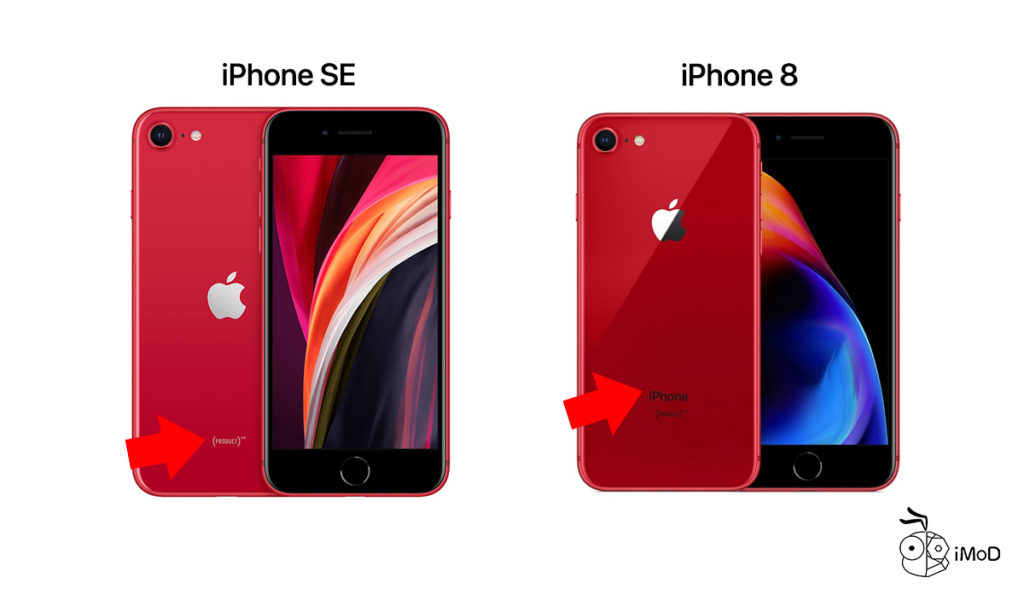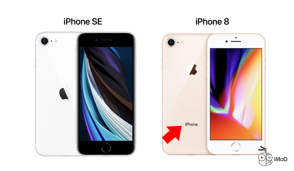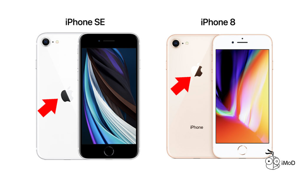 ตำแหน่งโลโก้ Apple ของ iPhone SE รุ่นที่ 2 จะอยู่ตรงกลางฝาหลังของเครื่อง ส่วนตำแหน่งโลโก้ของ iPhone 8 โลโก้ Apple จะอยู่ค่อนไปทางด้านบนของตัวเครื่อง
