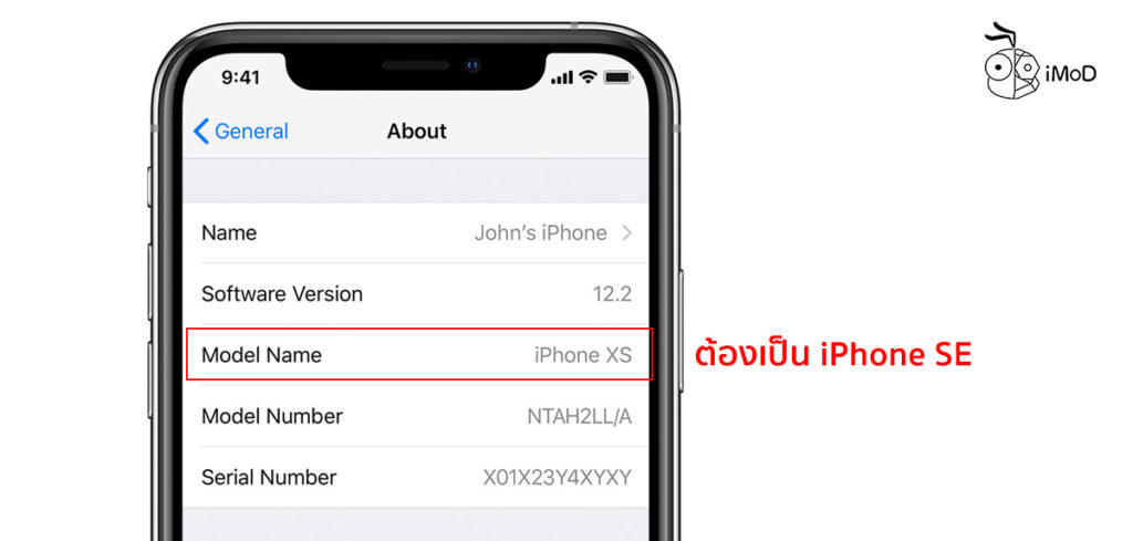 ไปที่ การตั้งค่า (Settings) > ทั่วไป (General) > เกี่ยวกับ (About) > ส่วนของชื่อ Model ต้องเป็น iPhone SE (รูปตัวอย่างเป็น iPhone XS ซึ่งถ้าซื้อรุ่นไหนชื่อ Model ก็ต้องเป็นรุ่นนั้น ๆ)