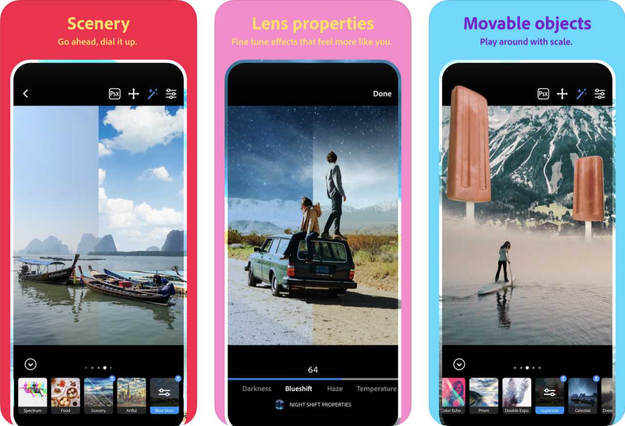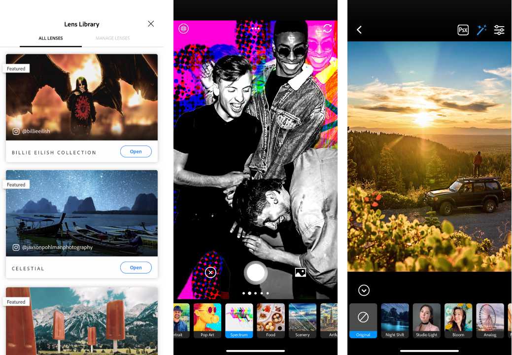 Photoshop Camera ยังมาพร้อมกับเลนส์และฟิลเตอร์สุด Amazing ไม่ซ้ำใครให้ทุกคนได้เลือกใช้ รวมถึงเลนส์สุดยูนีคจากศิลปินตัวแม่ของวงการ เช่น นักร้องสาวมากความสามารถอย่าง Billie Eilish, Arden Rose นักแสดงและ YouTuber ชื่อดัง รวมถึงช่างภาพคนดังอย่าง Brandon Woelfel ไม่เพียงเท่านี้ ผู้ใช้ยังได้สนุกกับเลนส์ใหม่ๆ ที่เราจะอัปเดตให้ทุกคนได้ใช้กันทุกสัปดาห์! เพื่อให้คุณได้สนุกไปกับเลนส์ใหม่ๆ ตลอดเวลา