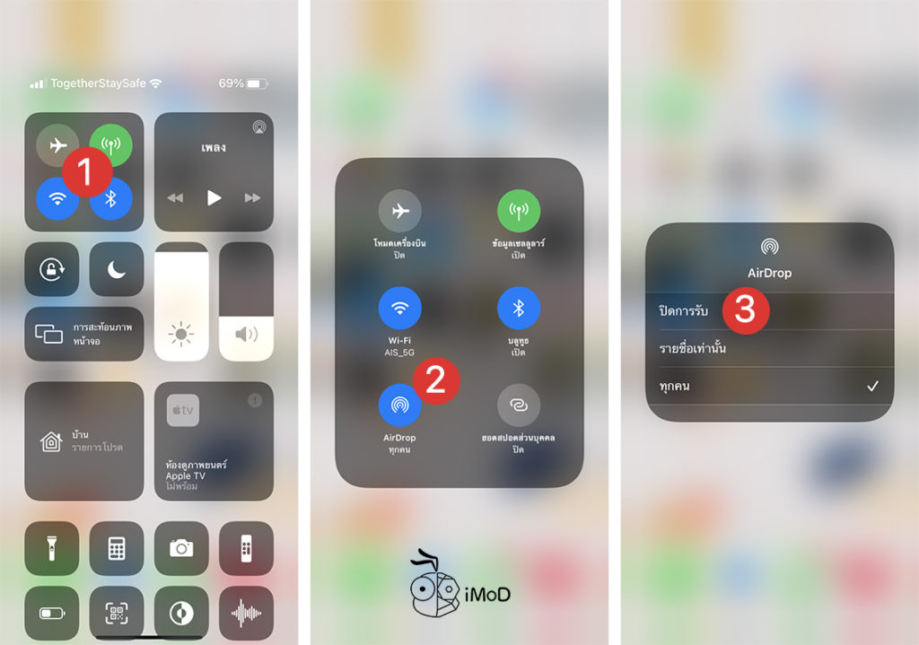 การลบผู้ติดต่อจากการส่ง AirDrop จะใช้วิธีการเปิดรับ AirDrop โดยไปที่ Control Center > แตะค้างที่ส่วนการเชื่อมต่อ > แตะค้างที่ AirDrop แล้วเลือก ปิดการรับ