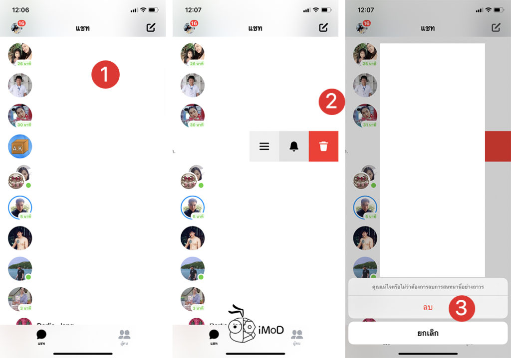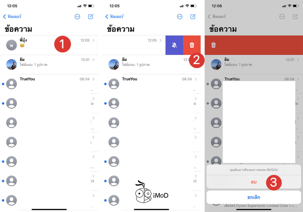 ส่วนวิธีลบผู้ติดต่อของแอป iMessage ก็จะใช้วิธีเดียวกันกับแอป Messenger แต่เราจะต้องไปลบการสทนาในแอป iMessage