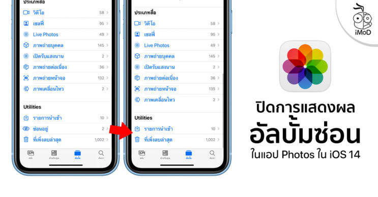 ใน iOS 13 เวอร์ชันปัจจุบัน เราสามารถเลือกซ่อนรูปภาพได้ รูปภาพจะถูกนำไปเก็บในส่วนของอัลบั้มซ่อน (Hidden) แต่ใน iOS 14 นั้นมีตัวเลือกให้เราปิดการแสดงผลอัลบั้มซ่อนในแอปรูปภาพ (Photos) ได้แล้ว