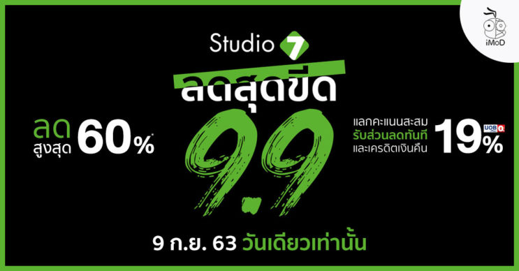 โปรโมชั่นเด็ด ๆ “Studio 7 ลดสุดขีด 9.9” สินค้าในร้านลดสูงสุด 60%* พร้อมแลกคะแนนสะสมรับส่วนลดทันที และรับเครดิตเงินคืน 19% ที่ Studio 7 ใกล้บ้าน 9 ก.ย. 63 วันเดียวเท่านั้น
