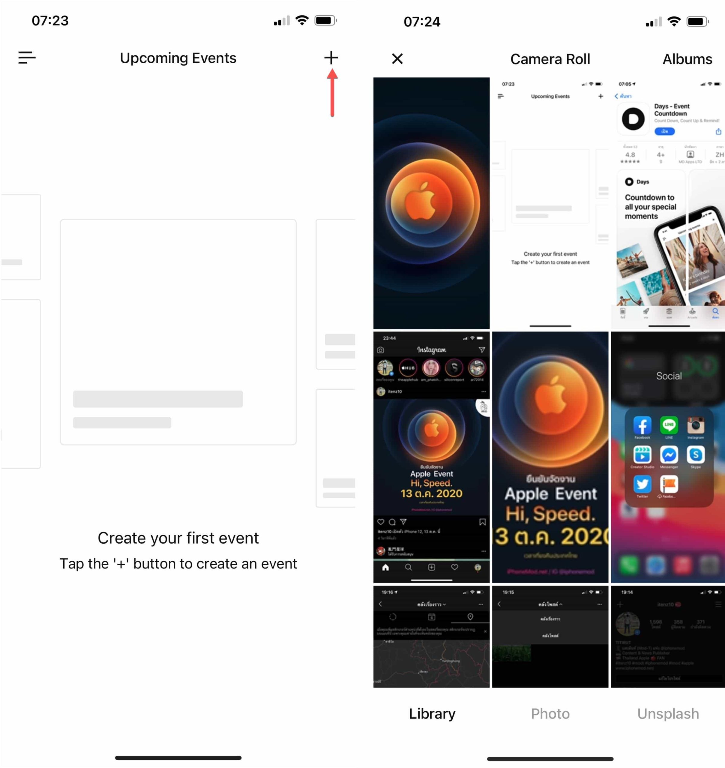 เปิดแอป Days > แตะ “+” > เลือกภาพพื้นหลังที่ต้องการ (Apple Event “Hi, Speed.” โหลดได้ที่นี่)