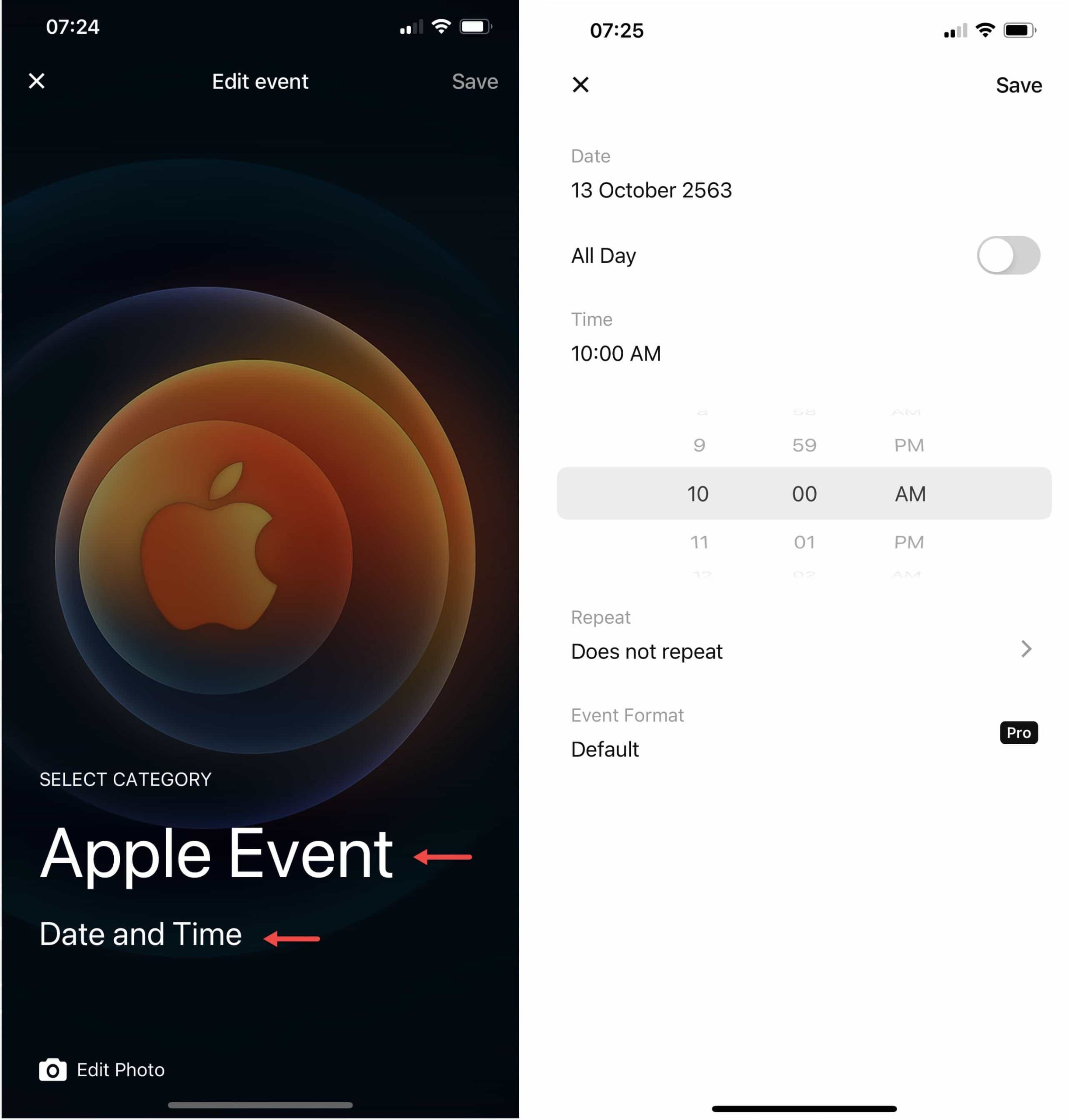 เพิ่มชื่องาน Event โดยแตะที่ Add Title แล้วตั้งชื่อตามต้องการ > จากนั้นตั้งวันงาน Event โดยแตะที่ Date and Time > ตั้งให้เป็นวันที่ 13 ต.ค. 63 และเลือกเวลางานเป็น 10.00 AM (เนื่องจากเลือก Time Zone ไม่ได้)