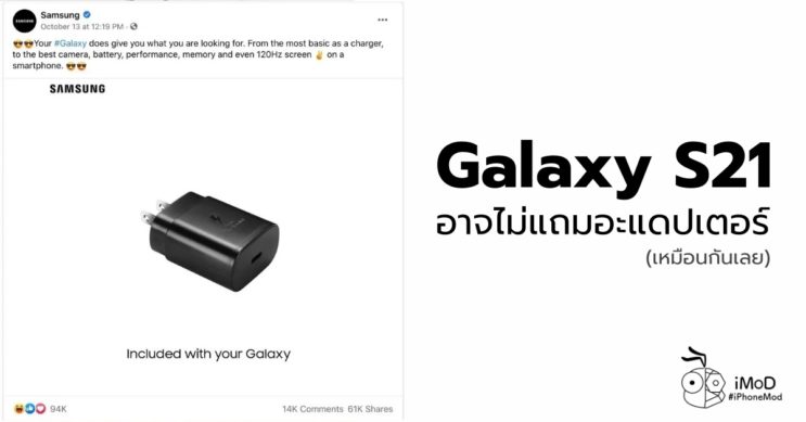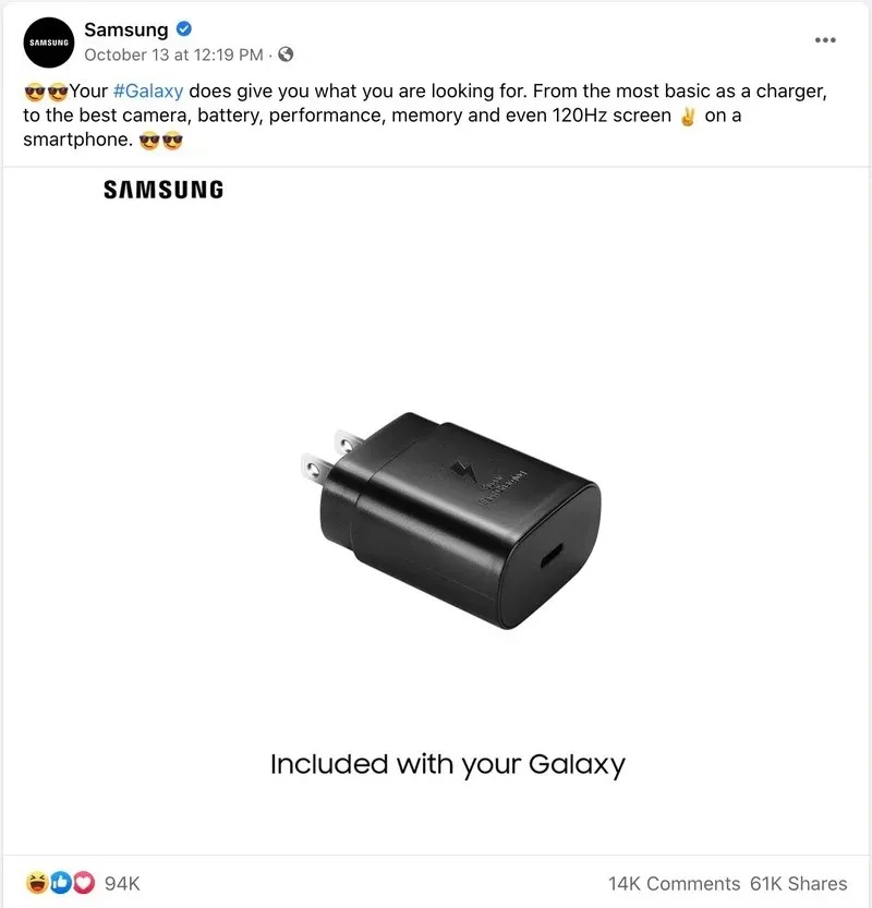 หากเรื่องนี้เป็นจริงเท่ากับ Samsung กลืนน้ำลายตัวเอง เพราะหลังจากวันที่ 13 ต.ค. ที่ทาง Apple ได้ประกาศเปิดตัว iPhone 12 ทางบัญชี Facebook ของแบรนด์ Samsung ก็ได้โพสต์รูปอะแดปเตอร์พร้อมกับข้อความว่า “รวมอยู่ใน Galaxy ของคุณ” เพื่อเป็นการแซวที่ Apple ไม่แถมอุปกรณ์ดังกล่าว