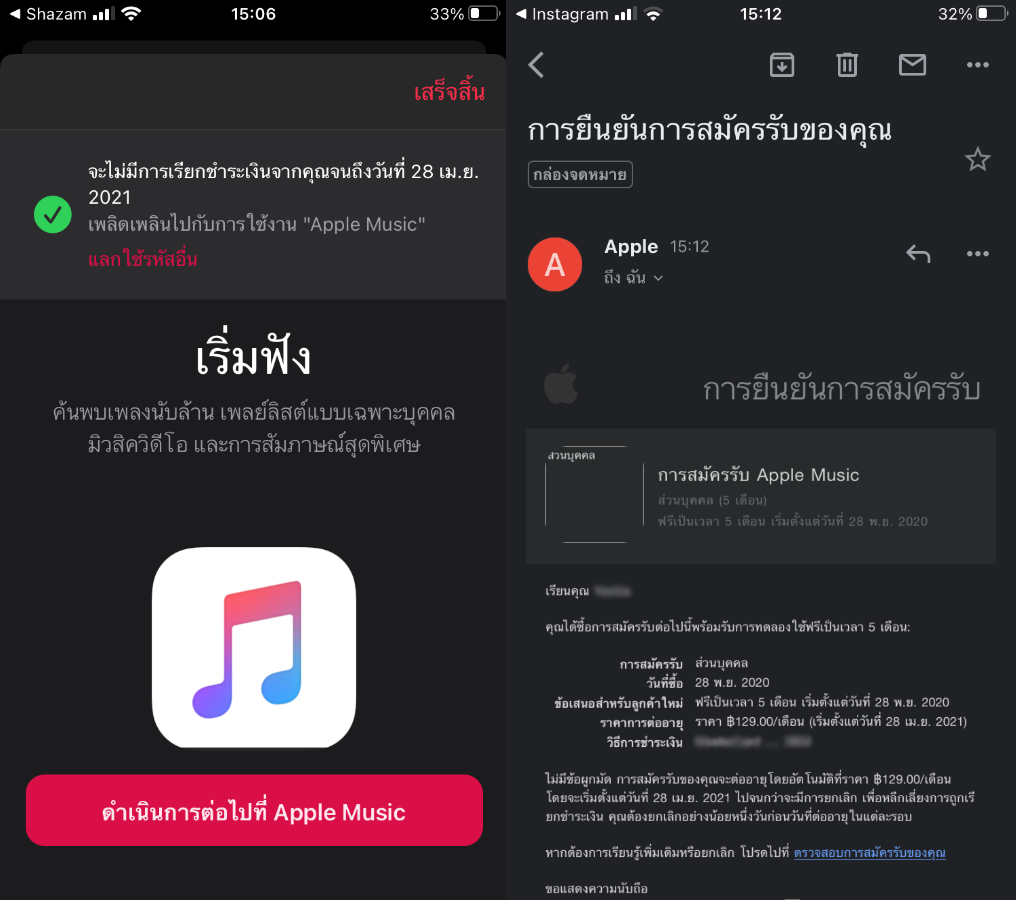 ผู้ใช้ใหม่ที่มีแอป Shazam และ Apple Music อยู่ในเครื่อง สามารถสมัครรับบริการ Apple Music ฟรี 5 เดือน ยกเลิกได้ทุกเมื่อ (หลังจากครบ 5 เดือน จ่ายเดือนละ 129 บาท) โดยสมัครได้ถึงวันที่ 17 มกราคม 2021