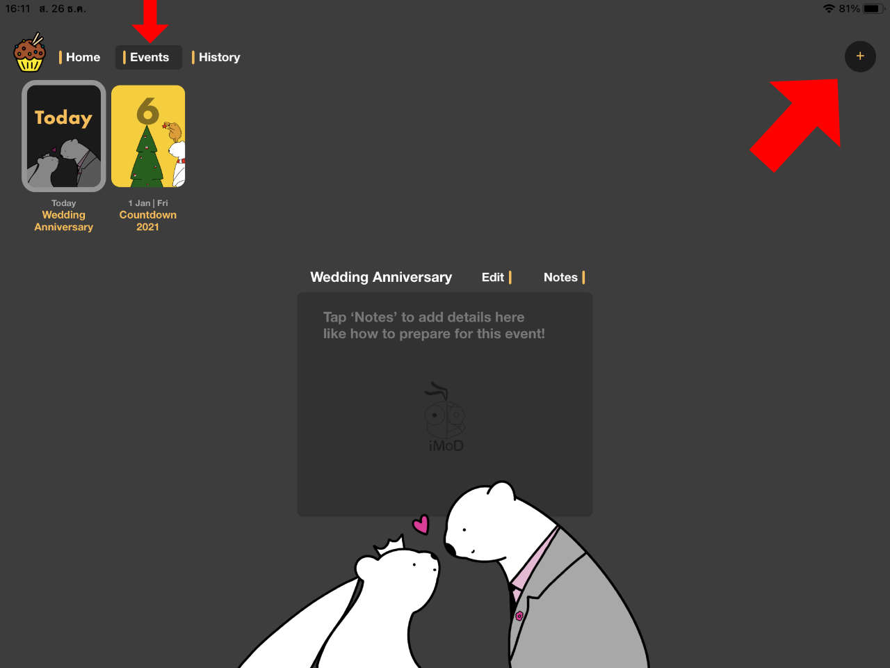 1. เข้าแอปฯ > ไปที่แถบ ‘Events’ > กดปุ่ม ‘+’ ที่มุมบนขวา