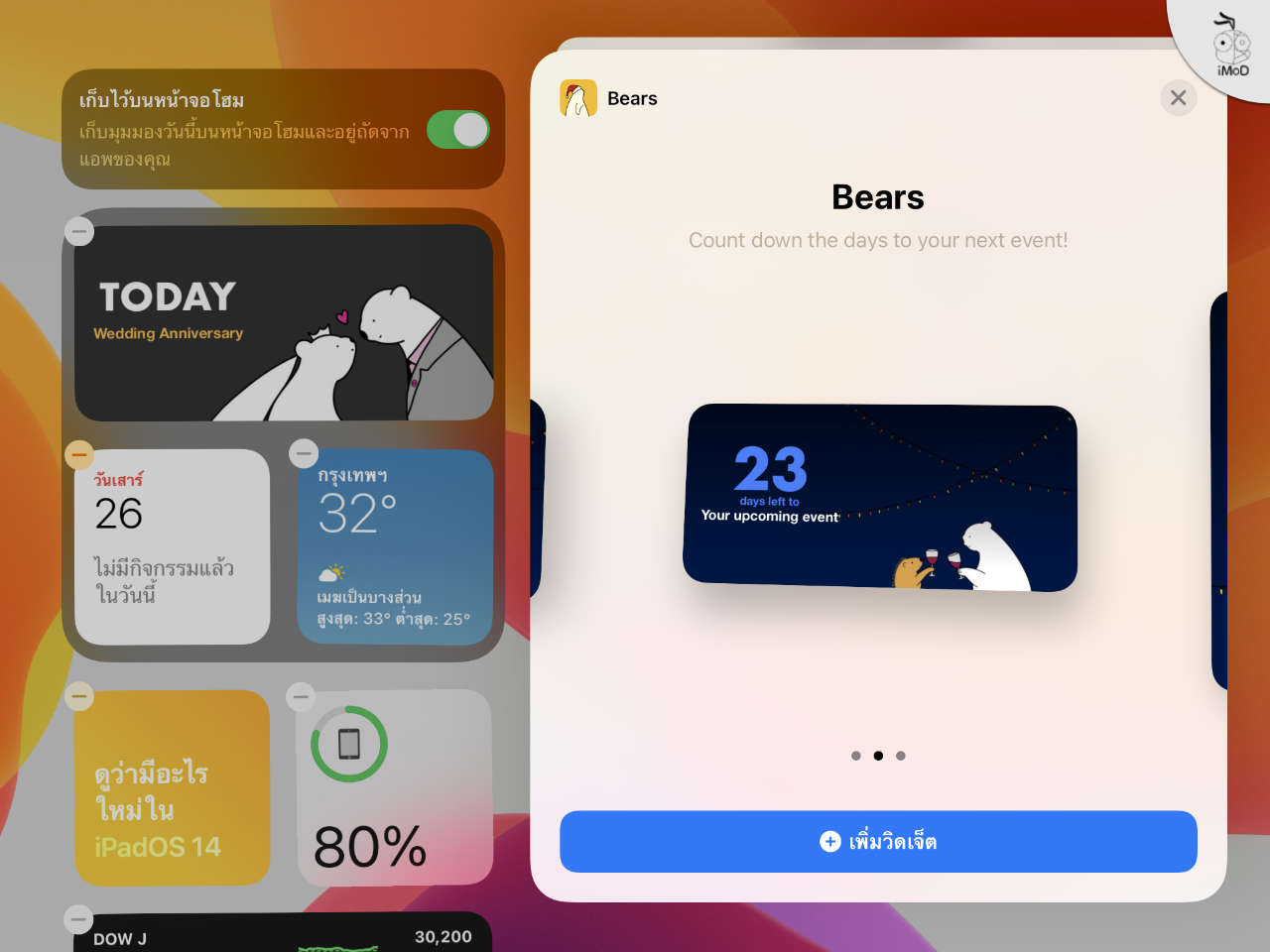 4. แอป Bears Countdown ติดตั้งมาพร้อมกับวิดเจ็ตที่รองรับ iOS 14 แล้ว สามารถกดปุ่ม + เข้าไปเลือกวิดเจ็ตในหน้า Home บน iPhone/iPad ของคุณได้เลยครับ (มีทั้งหมด 3 ขนาด)