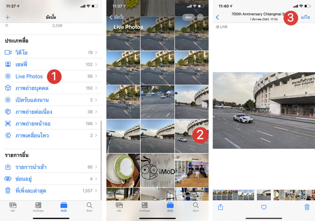 ไปที่แอปรูปภาพ (Photos) > อัลบั้ม Live Photos > เลือกรูปภาพ Live Photos ที่ต้องการ > แตะแก้ไข (Edit)