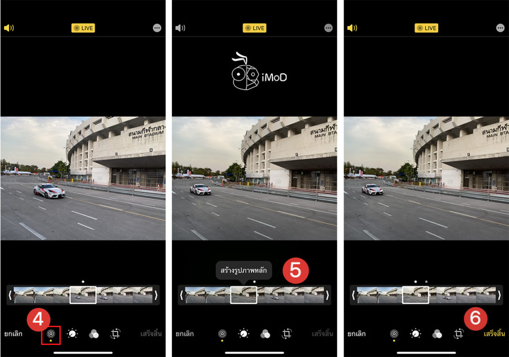 แตะไอคอน Live ด้านล่าง > เลื่อนรูปภาพด้านล่างเพื่อเปลี่ยนเฟรม เมื่อได้เฟรมที่ต้องการแล้วให้แตะ สร้างรูปภาพหลัก (Make Key Photo) > จากนั้นแตะ เสร็จสิ้น (Done)