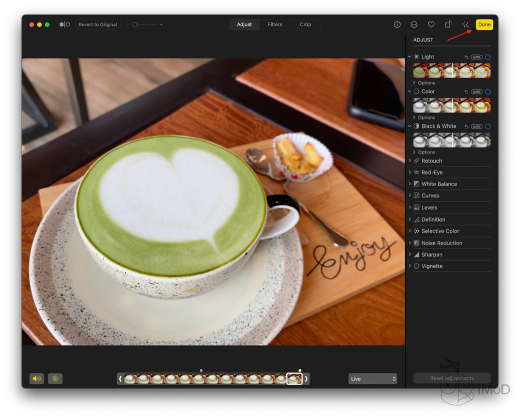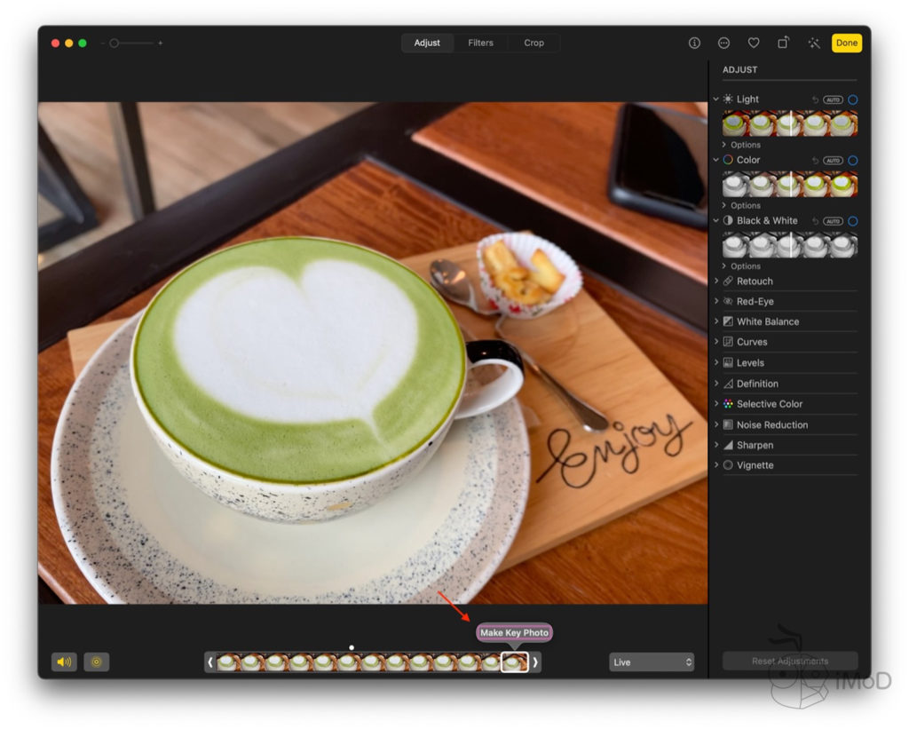 เราจะเห็นด้านล่าง เป็นภาพแต่ละเฟรมของภาพ Live Photos ให้เราเลื่อนซ้ายหรือขวา เพื่อเลือกเฟรมที่ต้องการนำมาเป็นภาพหลัก เมื่อได้ภาพที่ต้องการแล้ว ให้คลิกเลือก Make Key Photo