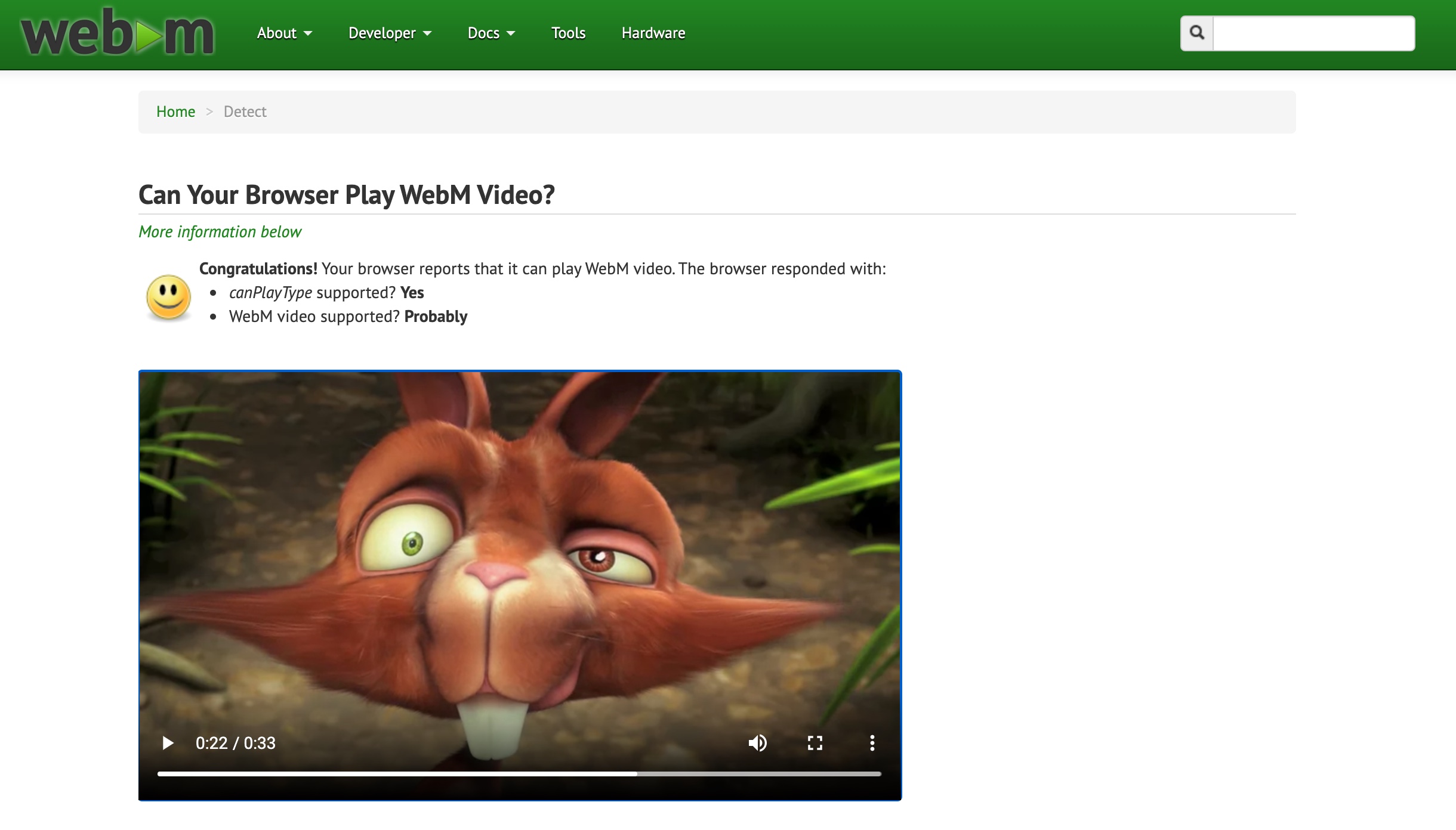 สำหรับการทดสอบว่า Safari ใน macOS เล่นวิดีโอ WebM ได้หรือไม่ ให้เข้าไปที่เว็บไซต์ https://www.webmproject.org/detect/