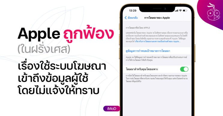 Bloomberg รายงานว่า Apple ถูกฟ้องร้องในฝรั่งเศส เรื่องการนำข้อมูลผู้ใช้ไปใช้ในระบบโฆษณาของ Apple เองโดยไม่แจ้งให้ผู้ใช้ทราบก่อน เข้าข่ายละเมิดความเป็นส่วนตัว