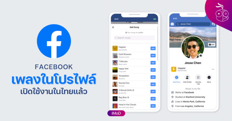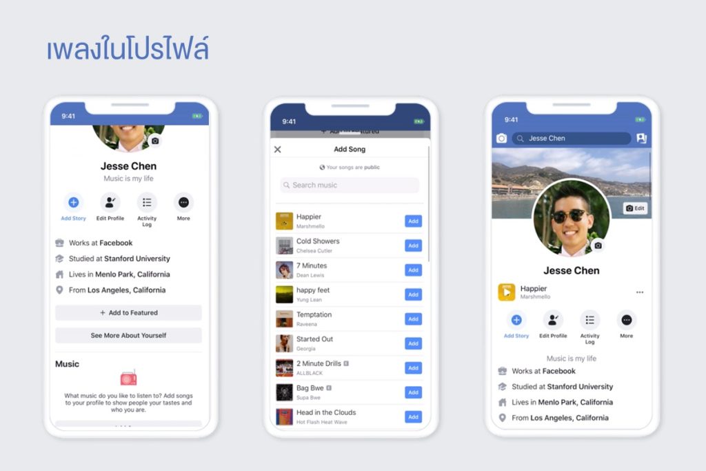 ฟีเจอร์ใหม่ เพิ่มเพลงในโปรไฟล์ Facebook ที่ผู้ใช้สามารถเพิ่มเพลงจาก Apple Music หรือ Spotify ให้เล่นในหน้าโปรไฟล์ได้ถึง 90 วินาที ผู้ฟังสามารถฟังเพลงเต็มต่อได้จากแอปทั้งสอง