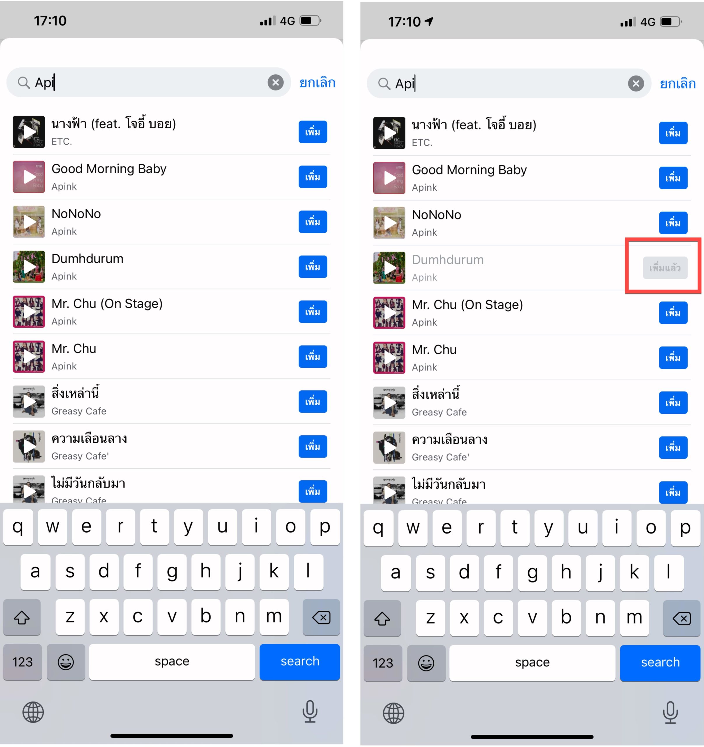 เลือกหรือค้นหาเพลงที่ต้องการ > เมื่อได้เพลงที่ต้องการแล้วแตะ “เพิ่ม”