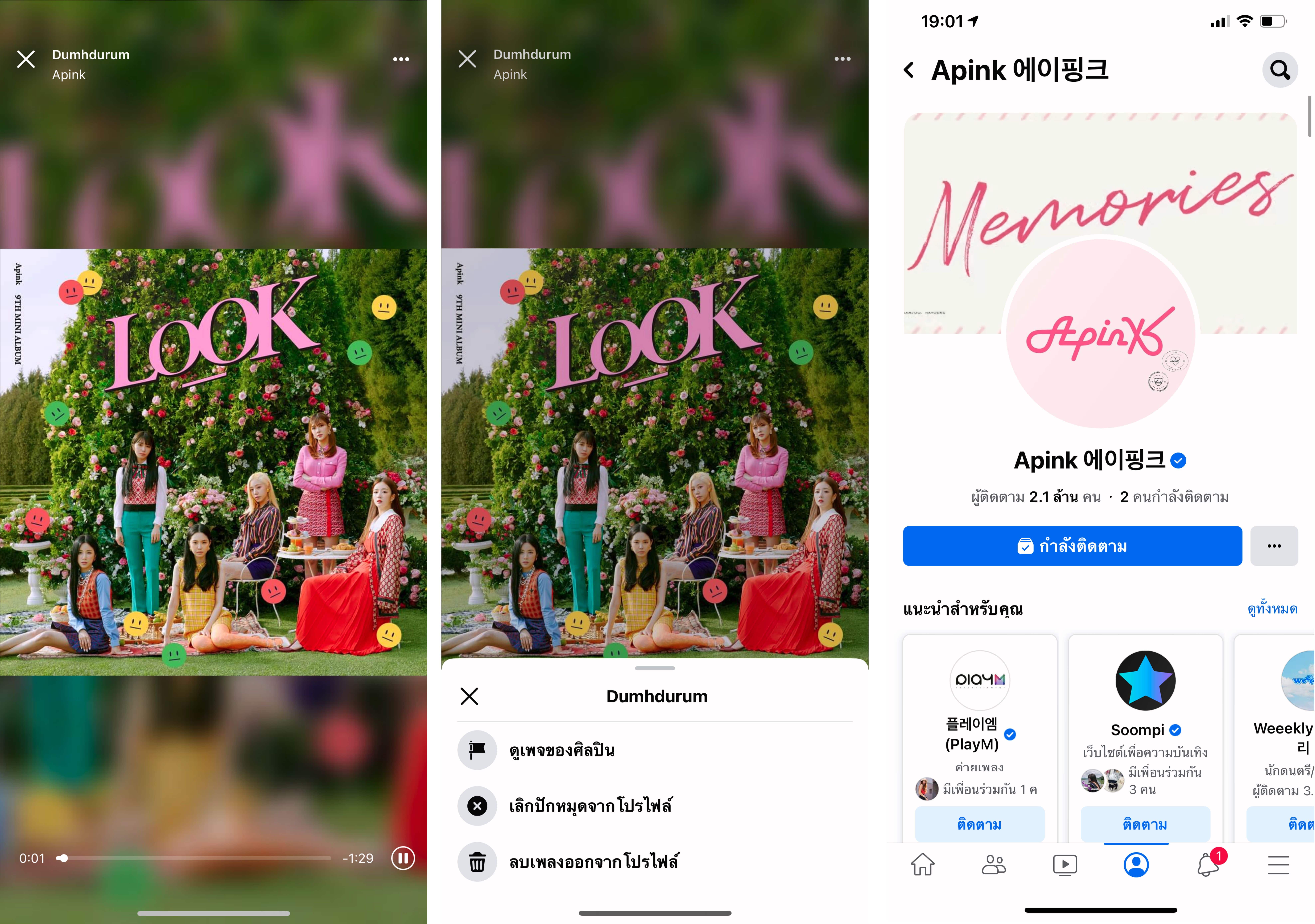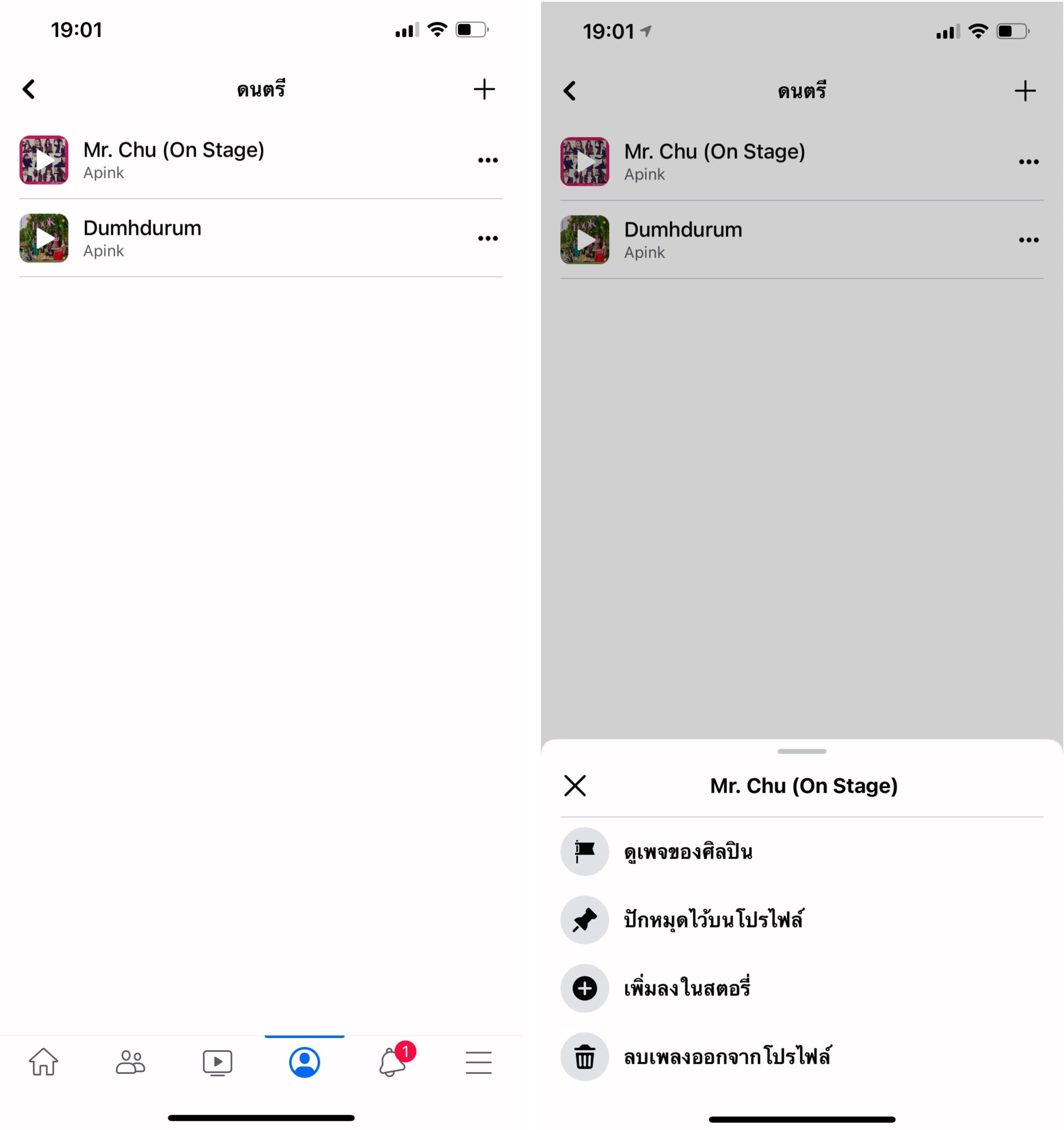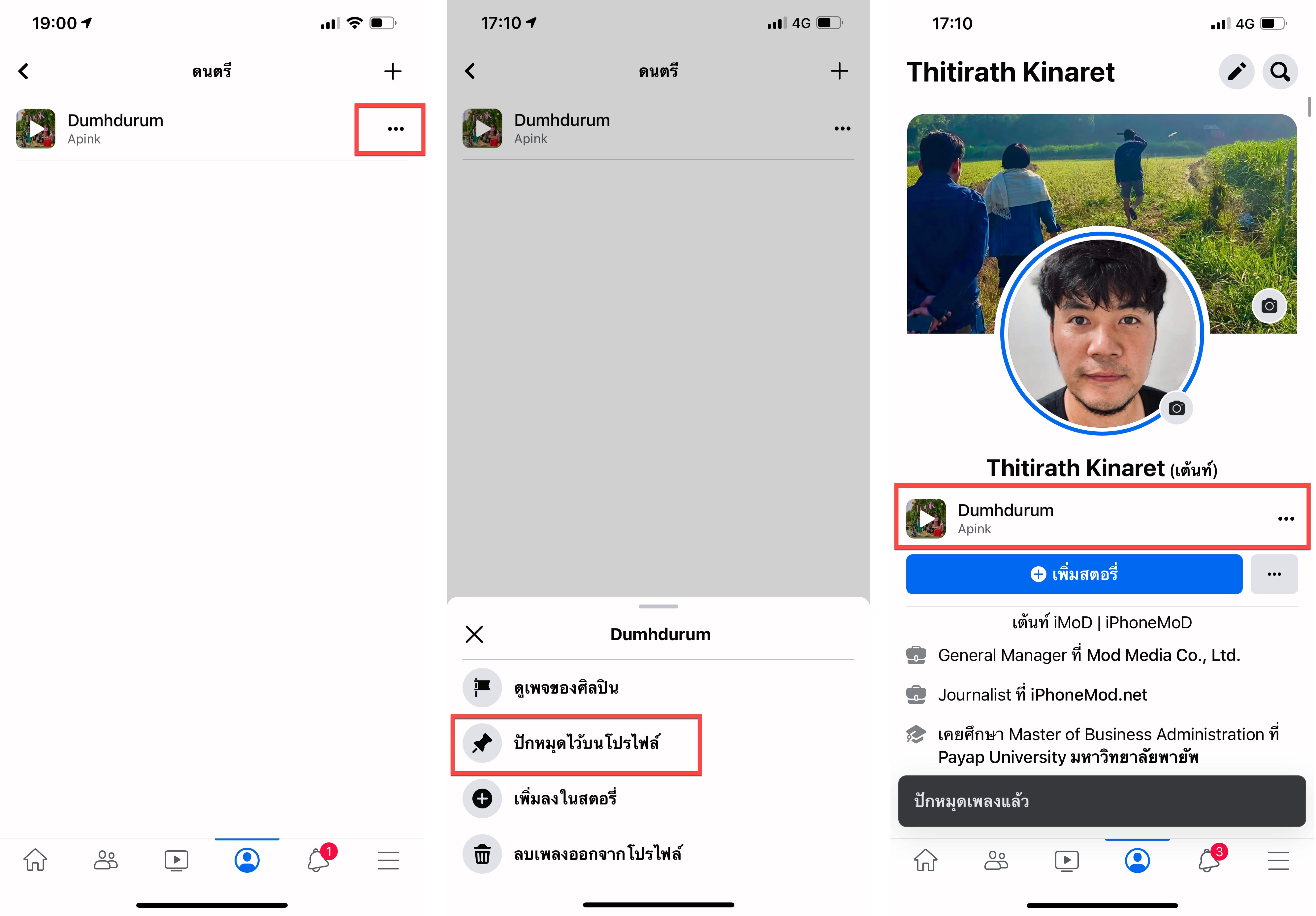 หลังจากเพิ่มเพลงเสร็จ ก็กลับไปที่เมนูเพลงอีกครั้ง > แตะ “…” เพื่อเลือกปักหมุดเพลงไว้บนโปรไฟล์ > เมื่อเลือกปักหมุดไว้บนโปรไฟล์ เพลงก็จะแสดงในหน้าโปรไฟล์ของเรา