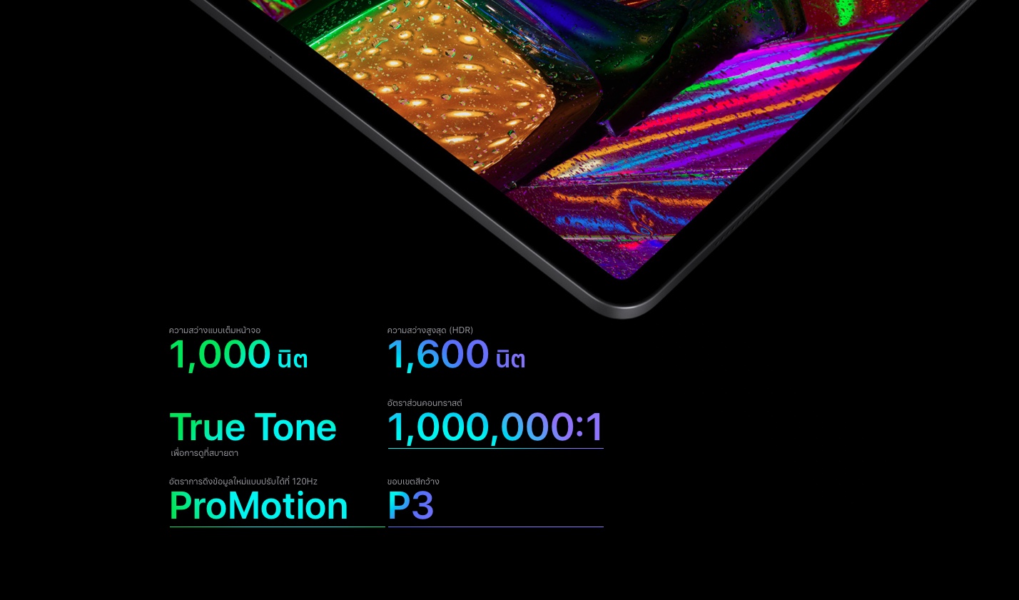 - หน้าจอ Liquid Retina XDR สว่างสูงสุด 1000 nits เฉพาะ 12.9 นิ้ว