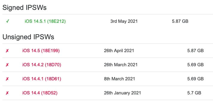 นั่นหมายความว่าผู้ใช้ ไม่สามารถ Downgrade, Signing, Restore หรือติดตั้ง Firmware iOS 14.5 (iPadOS 14.5) ได้ โดยในตอนนี้สามารถติดตั้งได้เพียง iOS 14.5.1 (iPadOS 14.5.1) เท่านั้น (11 พ.ค. 64)