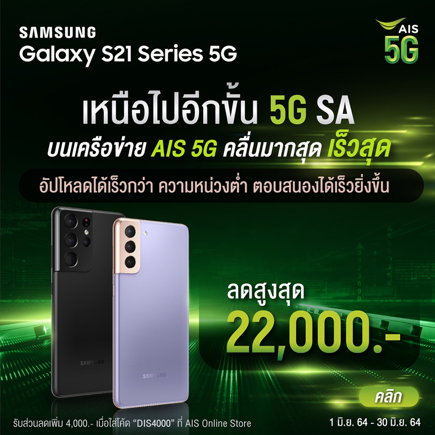 ลดสูงสุด 22,000 บาท และลดเพิ่มอีก 4,000 บาท เมื่อใส่ Code “DIS4000” ที่ AIS Online Store พร้อมรับเน็ต 5G แบบไม่จำกัด