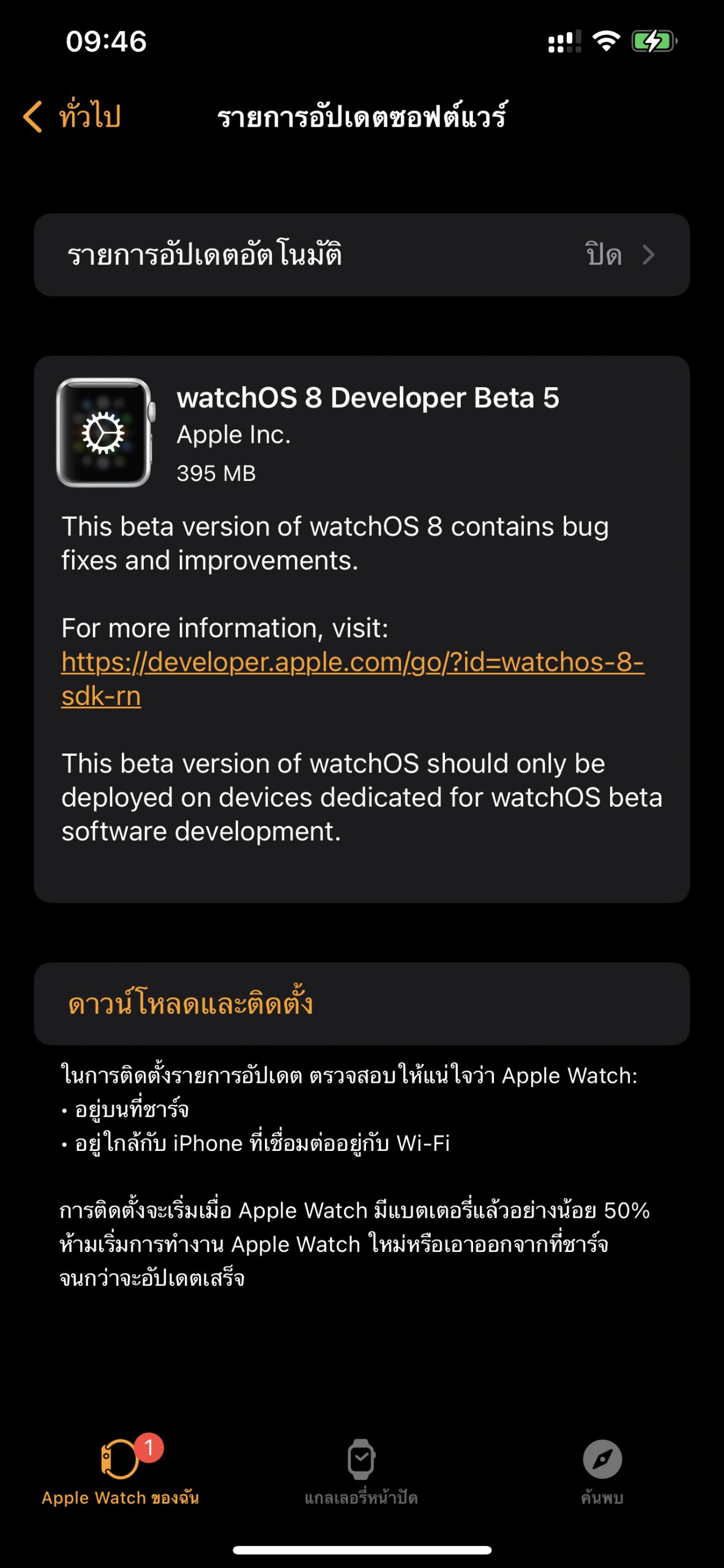 ผู้ลงทะเบียนทดสอบ watchOS 8 Beta อัปเดตได้เลยผ่าน Software Update ใน iPhone ที่เชื่อมต่อ, โดยวาง Apple Watch ไว้บนที่ชาร์จตลอดการอัปเดต และแบตต้องมากกว่า 50%