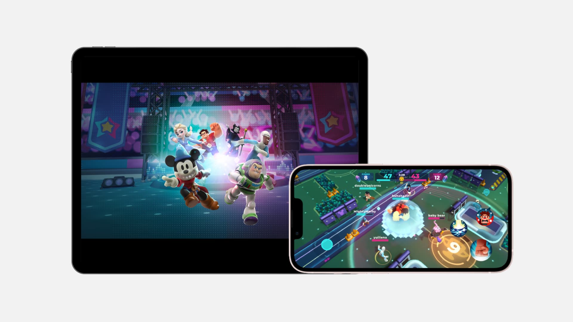 มีตัวละครตั้งแต่ราล์ฟจาก Wreck-It Ralph และมิกกี้ เมาส์ ไปจนถึงโฟรโซน โมอาน่า และบัซ ไลท์เยียร์ ผู้เล่นแต่ละคนจะได้เลือกฮีโร่สไตล์โฮโลแกรมที่มีความโดดเด่นไม่เหมือนใครเพื่อมาต่อสู้ร่วมกับเพื่อน ๆ เพื่อเอาชนะศัตรูแบบ 3 ต่อ 3 และขึ้นเป็นแชมเปี้ยน Disney ที่ทรงพลังที่สุด