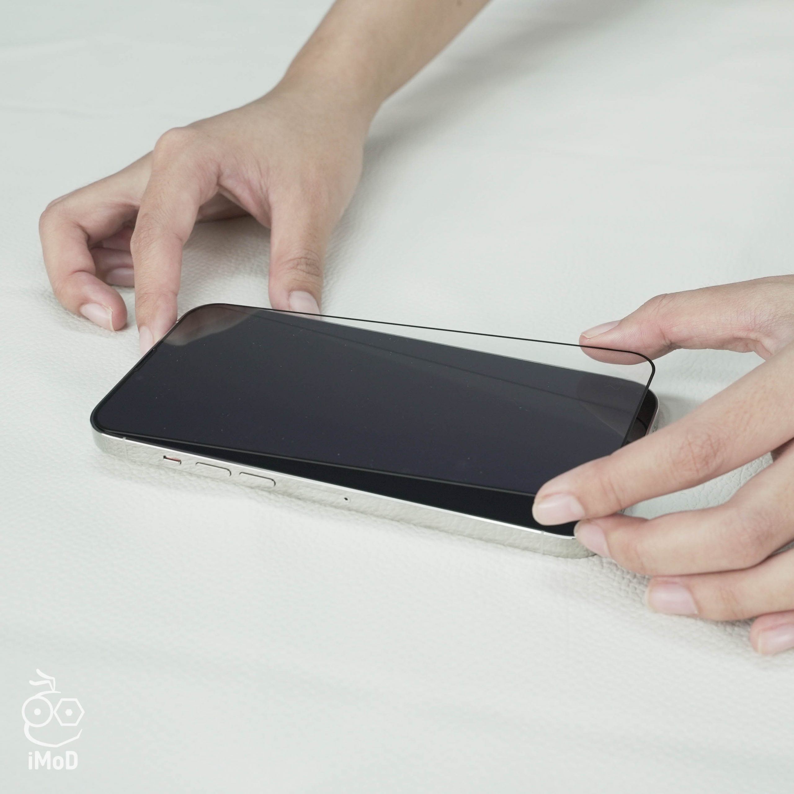 ลอกแผ่นอะคริลิคออกจากฟิล์มกระจก จากนั้นกะระยะการติดให้ตรงตามตำแหน่งที่ต้องการ และค่อย ๆ วางฟิล์มกระจกลงบนหน้าจอ โดยเริ่มจากตำแหน่งลำโพงหรือกล้องด้านหน้า ฟิล์มกระจกจะค่อย ๆ เรียบติดไปกับหน้าจอ ใช้นิ้วไล่ฟองอากาศจากตรงกลางจอไปยังขอบด้านข้างของจอ