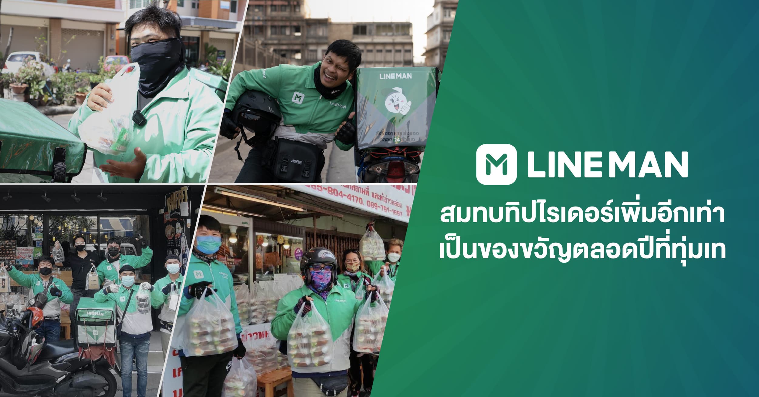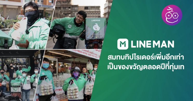 ไลน์แมนใจดี ตอบแทนไรเดอร์ทั่วประเทศ มอบทิปให้พี่ ๆ ไรเดอร์คูณ 2 เพื่อสนับสนุนและเป็นกำลังใจที่ทำงานหนักมาทั้งปี ส่งความสุขให้แก่ลูกค้า LINE MAN ตลอดมา