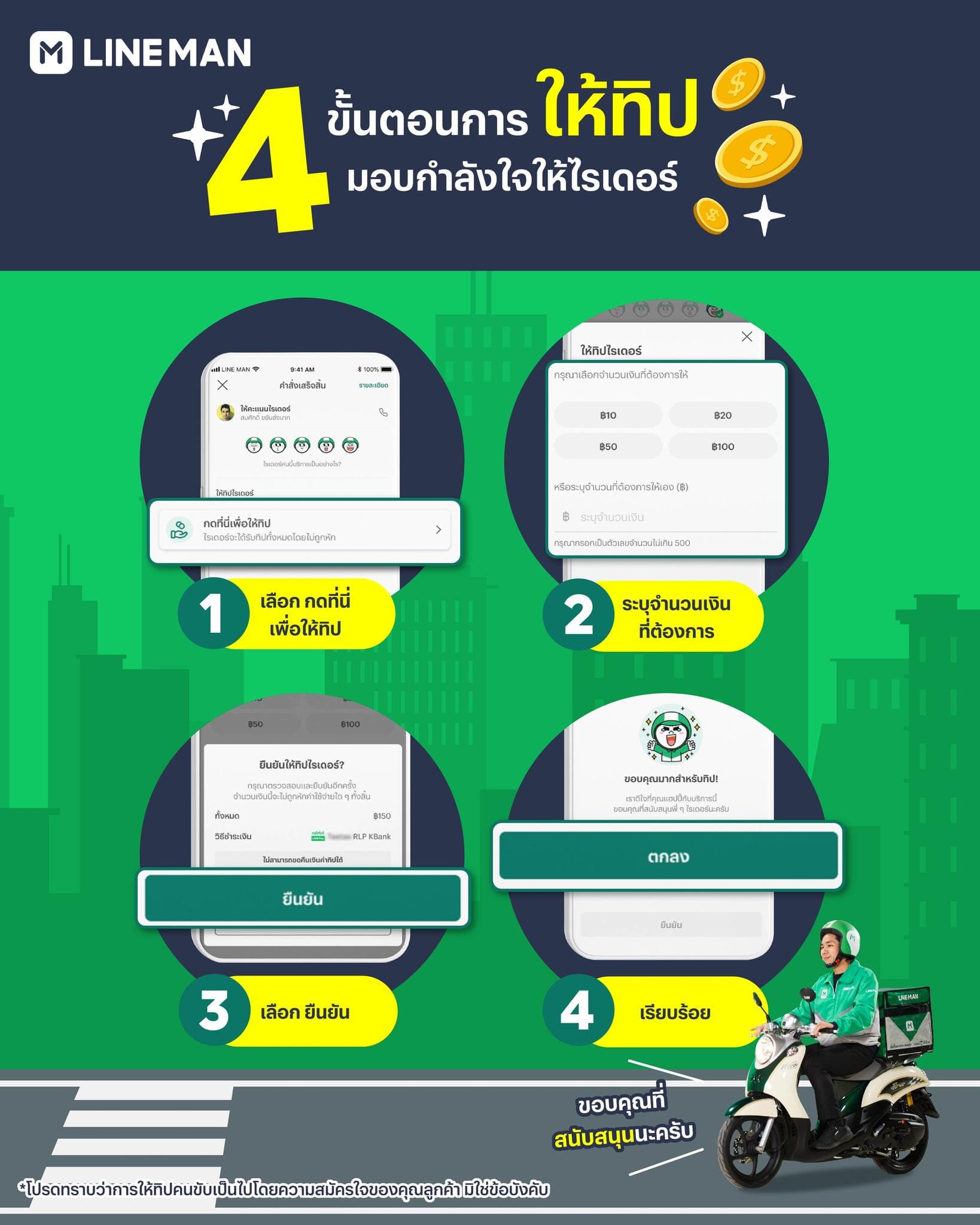 ใครที่เป็นลูกค้าไลน์แมนอยู่แล้ว อย่าลืมให้ทิปพี่ ๆ ไรเดอร์ไลน์แมน เพื่อเป็นกำลังใจให้พี่ ๆ ไรเดอร์ในปีต่อไป