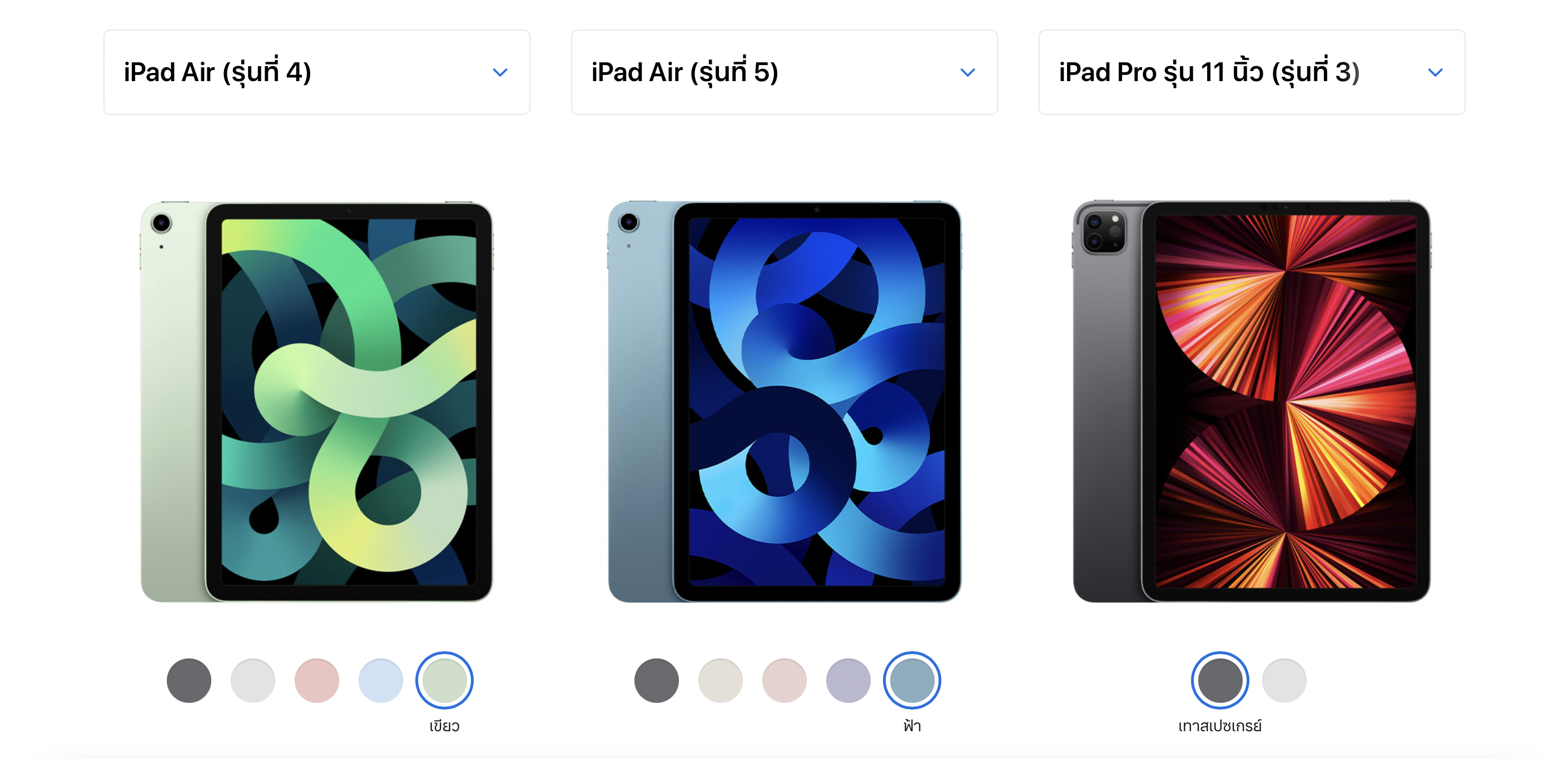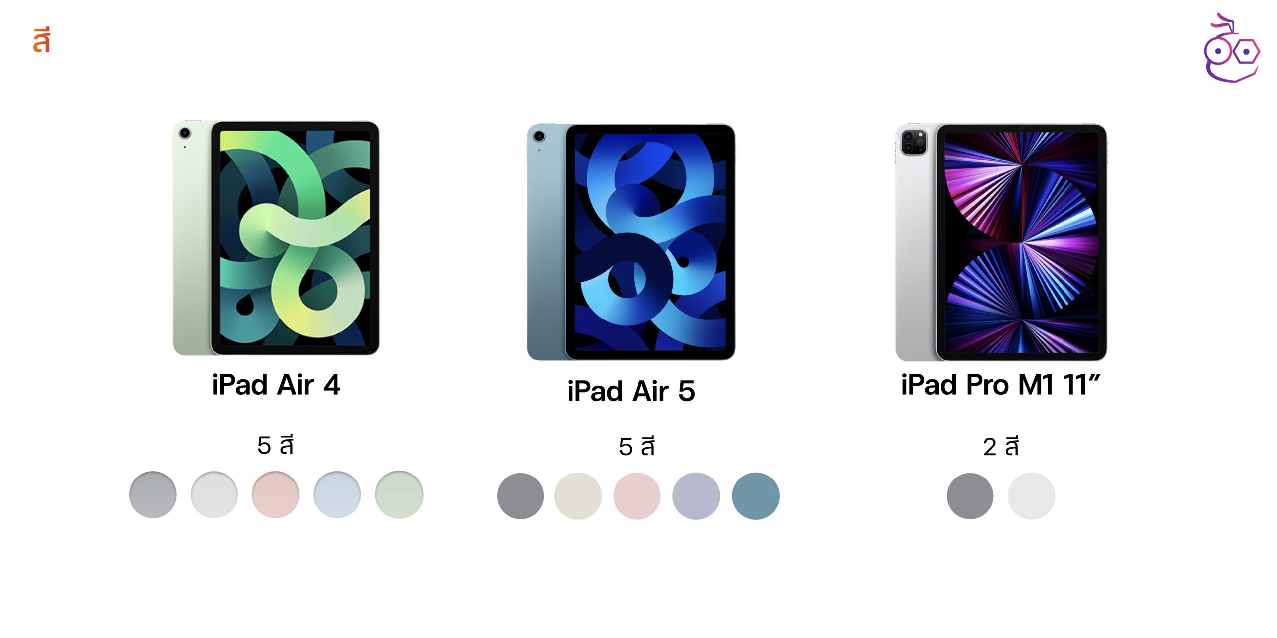 - iPad Air 5 : มาพร้อม 5 สี ได้แก่ สีเทาสเปซเกรย์, สีสตาร์ไลท์, สีชมพู, สีม่วง และ สีฟ้า